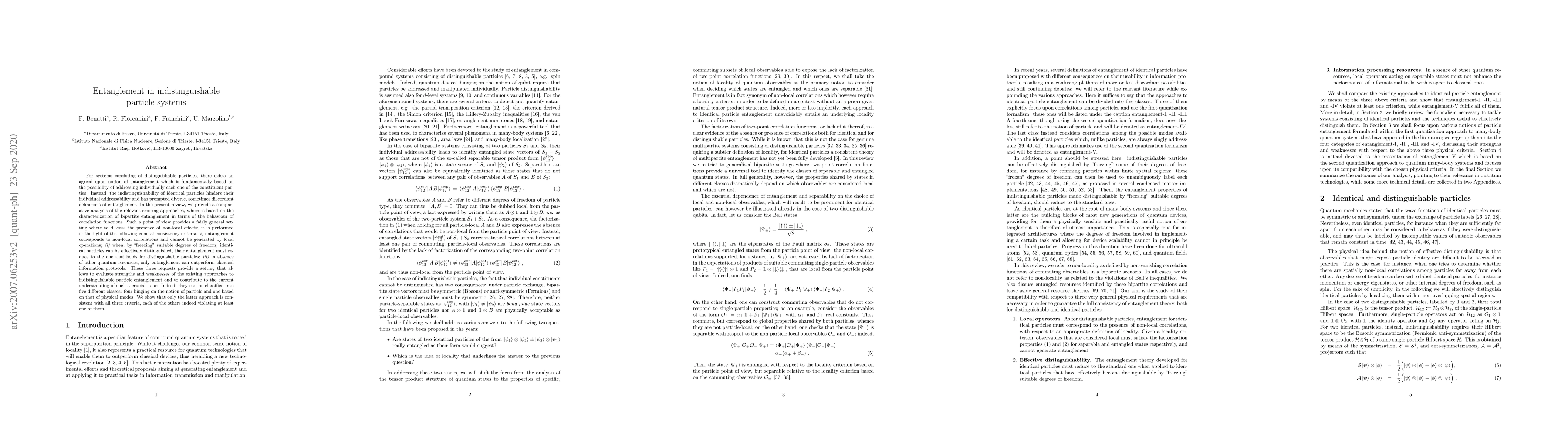 The paper provides a comparative analysis of existing approaches to entanglement in indistinguishable particle systems, using correlation functions and consistency criteria.