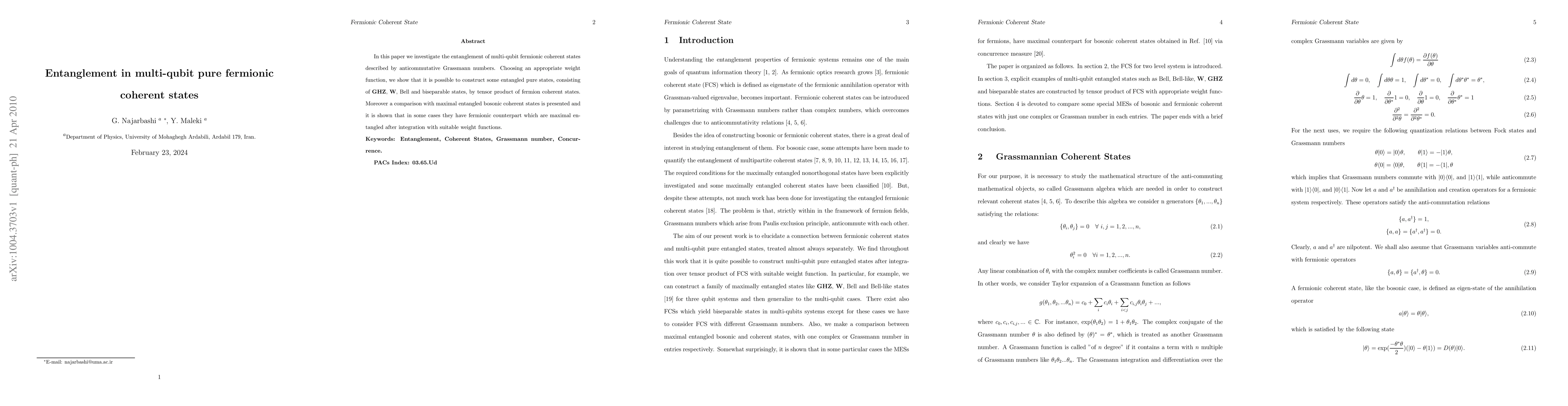 This paper explores the entanglement in multi-qubit pure fermionic coherent states using anticommutative Grassmann numbers, constructing various entangled states via tensor products. It also compares these states with maximal entangled bosonic coherent states, showing that some fermionic states can be maximal entangled after integration with appropriate weight functions.