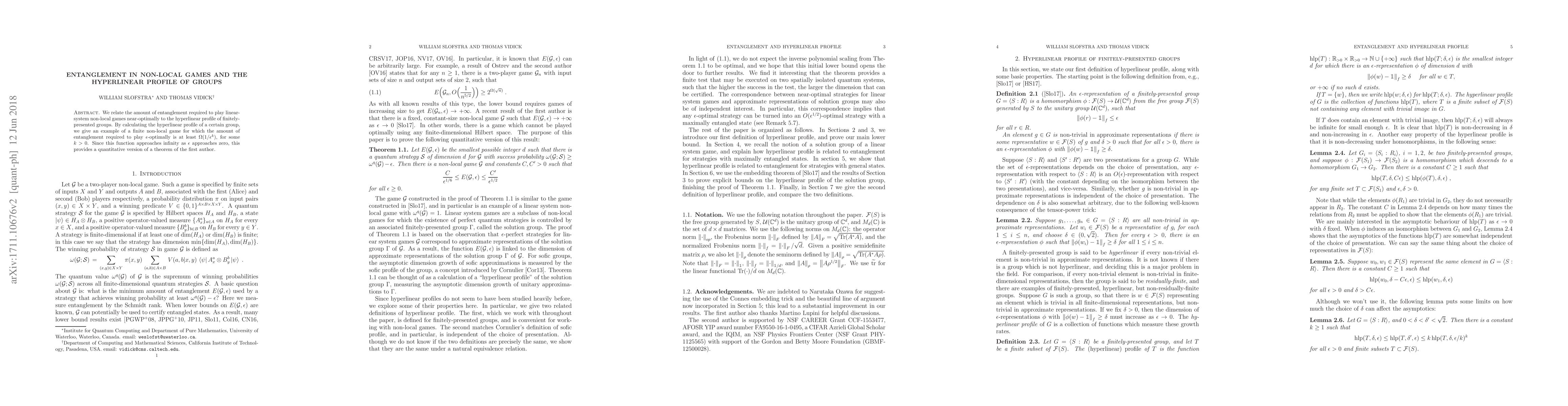 We relate the amount of entanglement required to play linear-system non-local games near-optimally to the hyperlinear profile of finitely-presented groups. By calculating the hyperlinear profile of a certain group, we give an example of a finite non-local game for which the amount of entanglement required to play $\varepsilon$-optimally is at least $\Omega(1/\varepsilon^k)$, for some $k>0$. Since this function approaches infinity as $\varepsilon$ approaches zero, this provides a quantitative version of a theorem of the first author.