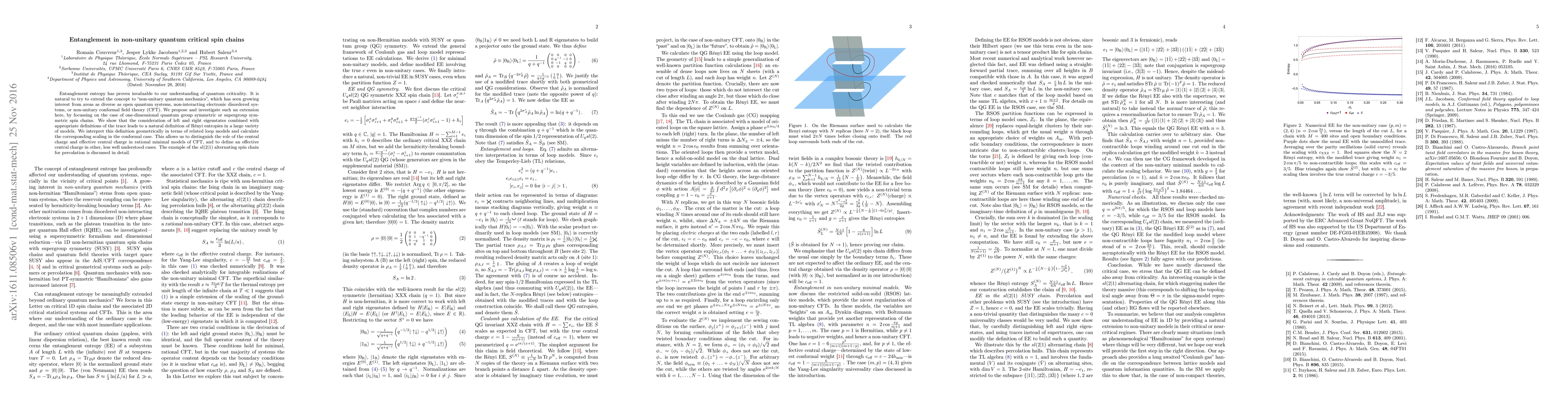 This paper proposes an extension of entanglement entropy to non-unitary quantum mechanics, particularly in quantum group symmetric spin chains. It defines Rényi entropies and interprets them geometrically in terms of loop models, distinguishing roles of central charges in conformal field theory and defining an effective central charge for less understood cases.