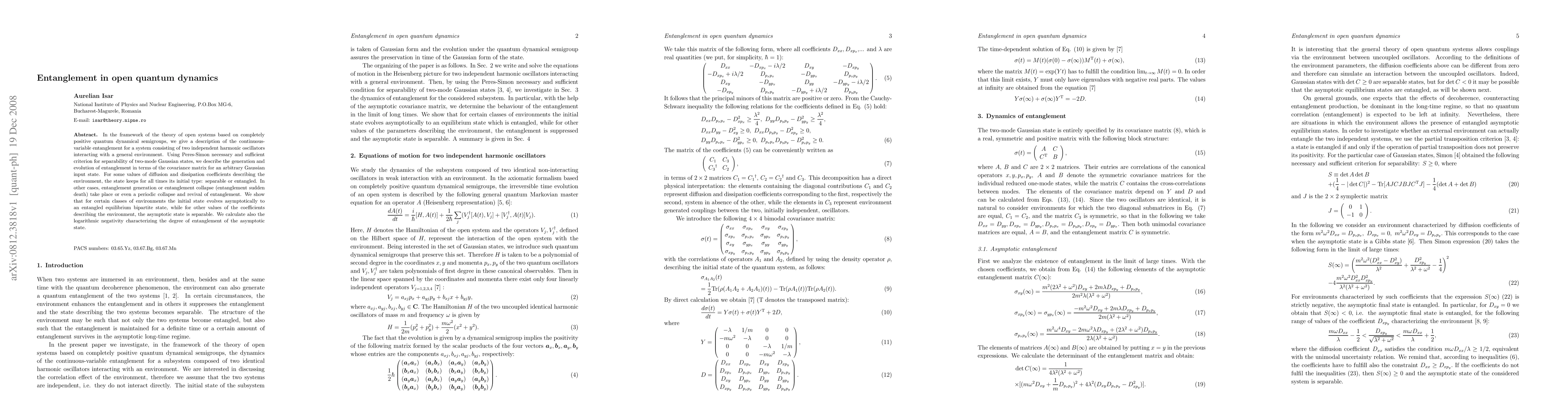 This paper explores the dynamics of entanglement in open quantum systems using completely positive quantum dynamical semigroups, focusing on two independent harmonic oscillators interacting with an environment. It examines the generation, evolution, and eventual asymptotic state of entanglement, revealing scenarios of entanglement collapse, revival, and the emergence of equilibrium entangled states.