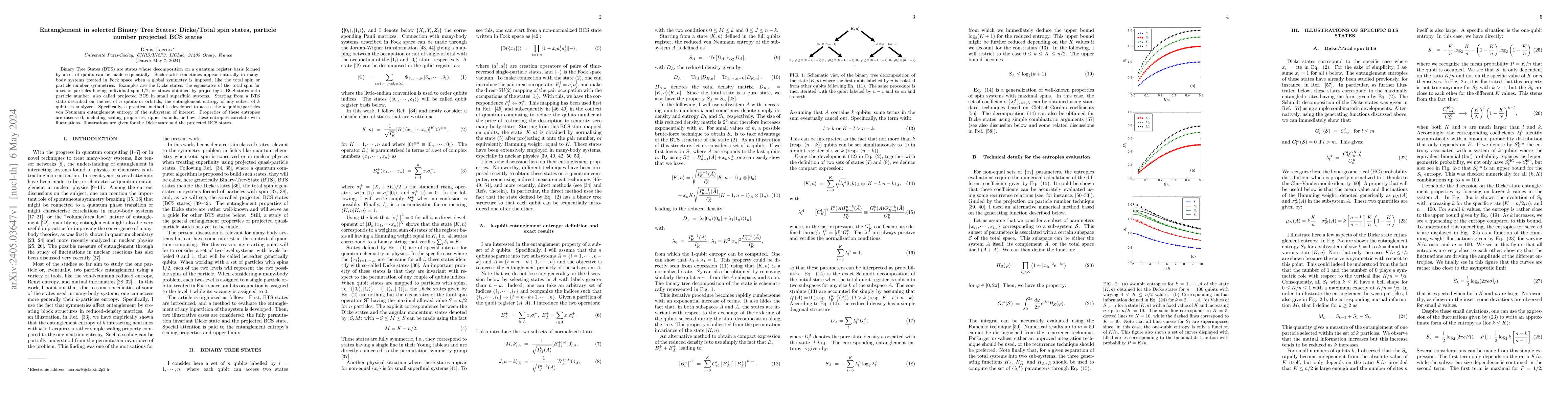 This paper analyzes entanglement in Binary Tree States (BTS) like Dicke and projected BCS states, developing a method to compute the von Neumann entanglement entropy for subsets of qubits. It discusses scaling properties, upper bounds, and correlations with fluctuations in these entangled states.