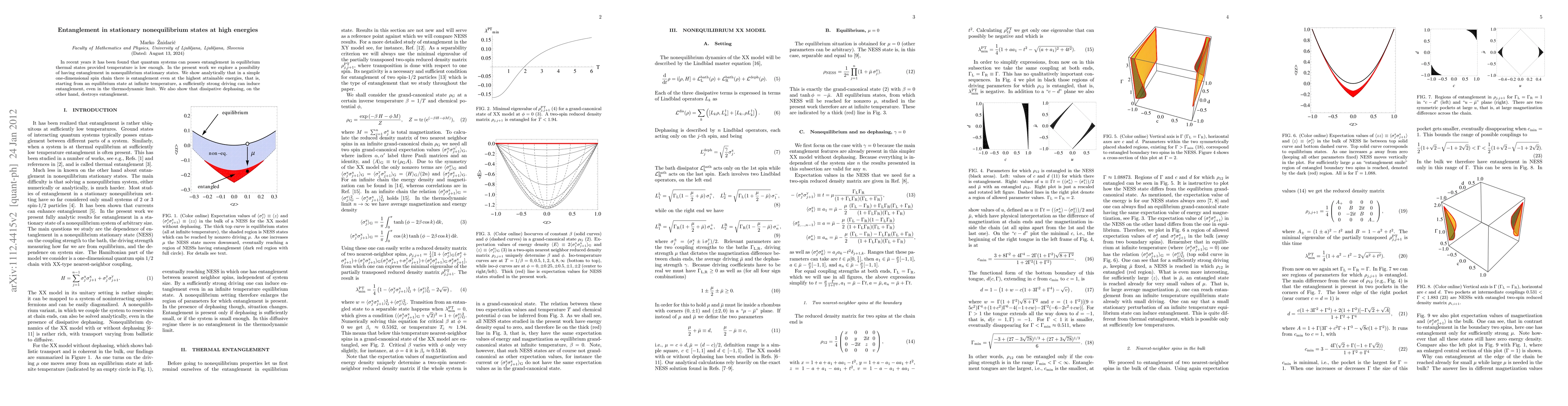 This paper investigates entanglement in nonequilibrium stationary states at high energies, demonstrating analytically that a one-dimensional spin chain can maintain entanglement even at infinite temperature through strong driving, while dissipative dephasing destroys it.