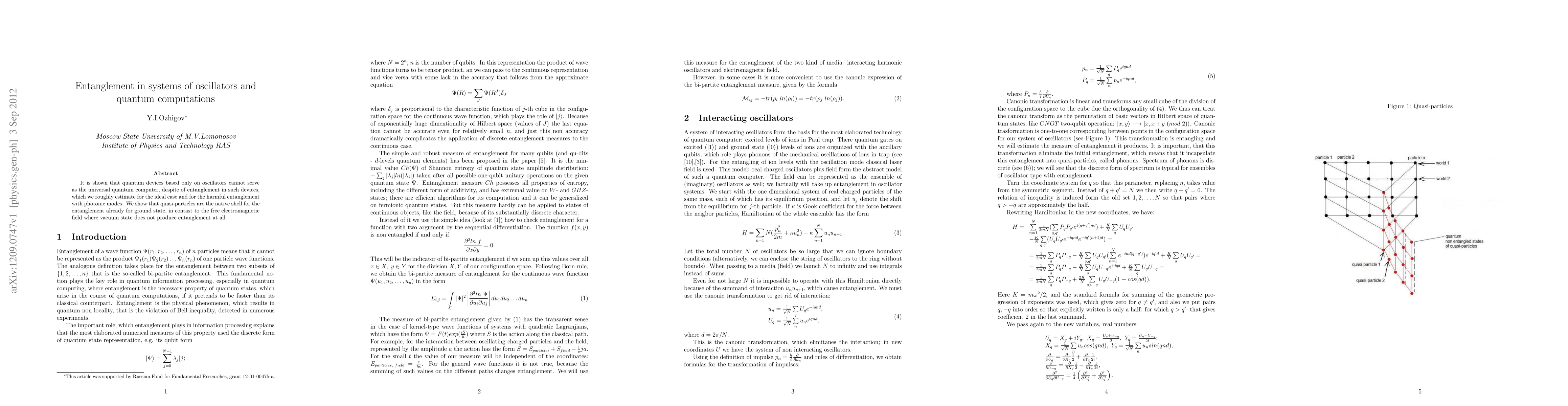 It is shown that quantum devices based only on oscillators cannot serve as the universal quantum computer, despite of entanglement in such devices, which we roughly estimate for the ideal case and for the harmful entanglement with photonic modes. We show that quasi-particles are the native shell for the entanglement already for ground state, in contast to the free electromagnetic field where vacuum state does not produce entanglement at all.