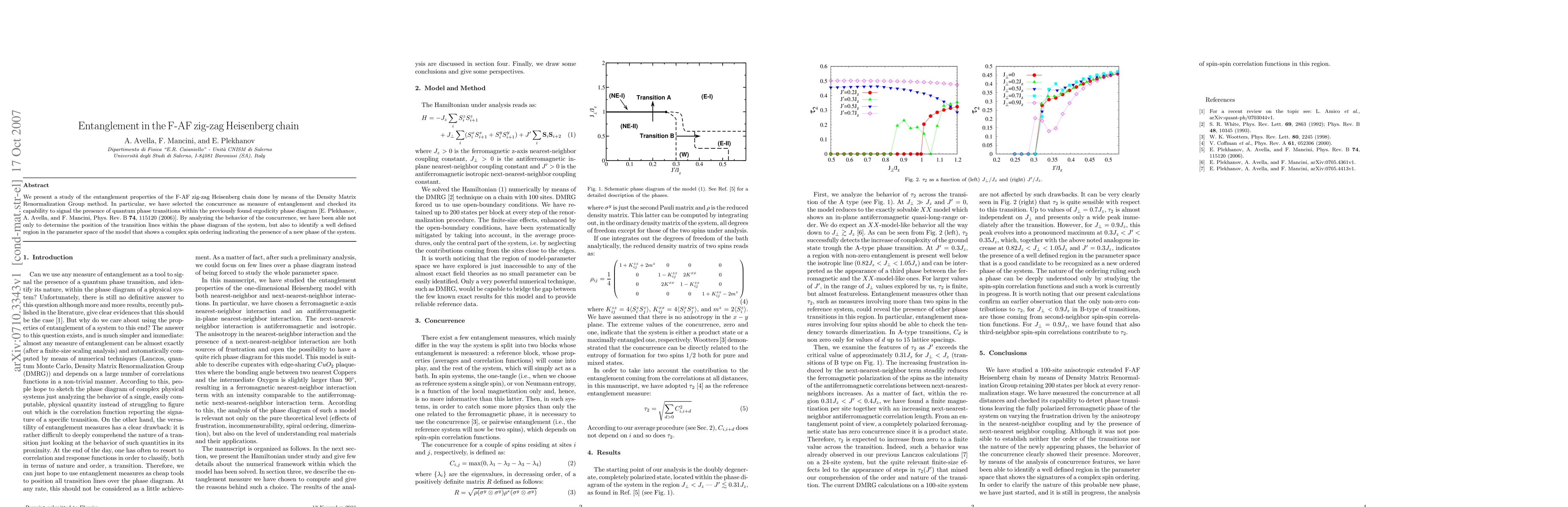 This study investigates the entanglement properties of the F-AF zig-zag Heisenberg chain using the Density Matrix Renormalization Group method, focusing on the concurrence as a measure of entanglement. The research identifies transition lines and a new phase characterized by complex spin ordering within the system's phase diagram.