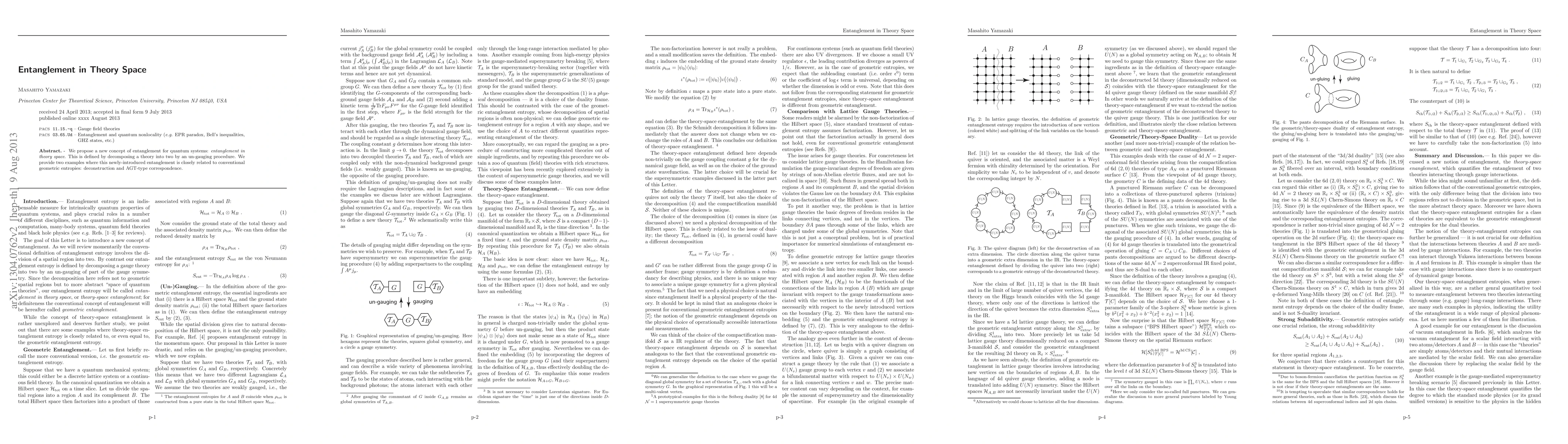 We propose a new concept of entanglement for quantum systems: entanglement in theory space. This is defined by decomposing a theory into two by an un-gauging procedure. We provide two examples where this newly-introduced entanglement is closely related with conventional geometric entropies: deconstruction and AGT-type correspondence.