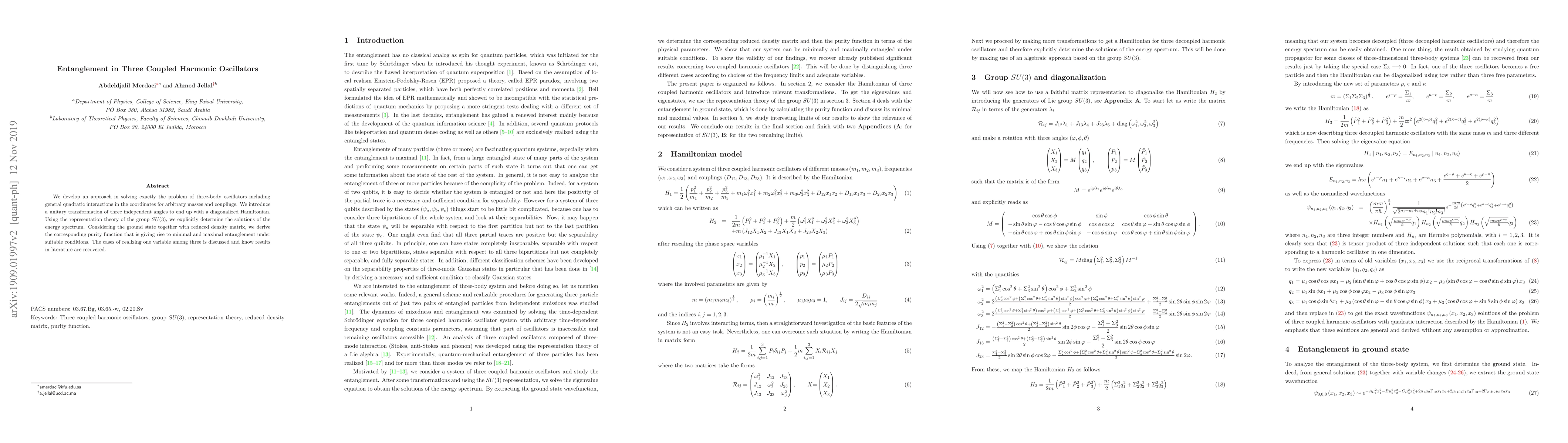 This paper presents an exact solution for three coupled harmonic oscillators with general quadratic interactions, utilizing a unitary transformation and $SU(3)$ group theory to determine the energy spectrum. It also explores entanglement in the system, deriving the purity function and discussing conditions for minimal and maximal entanglement.
