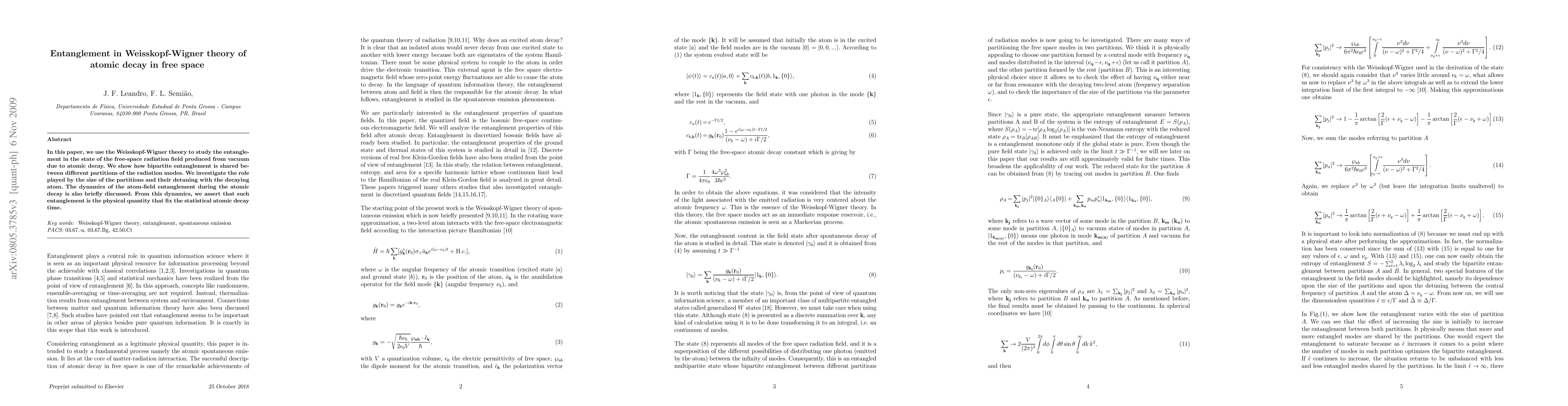 Researchers used the Weisskopf-Wigner theory to study entanglement in radiation fields created by atomic decay in free space. They found that entanglement is shared between different partitions of the radiation modes, with its dynamics affecting the statistical decay time of atoms.