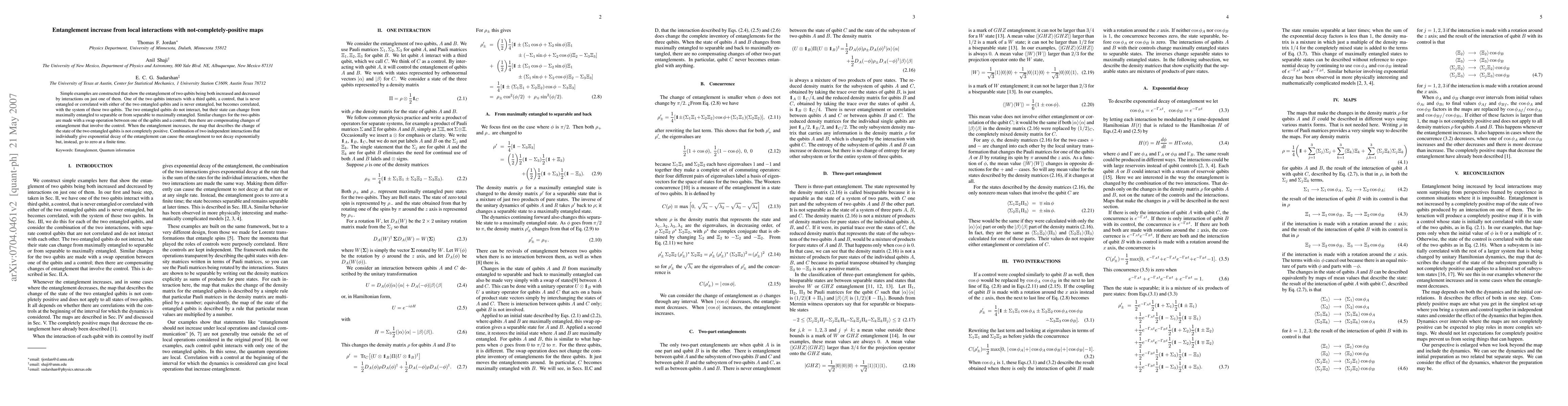Simple examples are constructed that show the entanglement of two qubits being both increased and decreased by interactions on just one of them. One of the two qubits interacts with a third qubit, a control, that is never entangled or correlated with either of the two entangled qubits and is never entangled, but becomes correlated, with the system of those two qubits. The two entangled qubits do not interact, but their state can change from maximally entangled to separable or from separable to maximally entangled. Similar changes for the two qubits are made with a swap operation between one of the qubits and a control; then there are compensating changes of entanglement that involve the control. When the entanglement increases, the map that describes the change of the state of the two entangled qubits is not completely positive. Combination of two independent interactions that individually give exponential decay of the entanglement can cause the entanglement to not decay exponentially but, instead, go to zero at a finite time.
