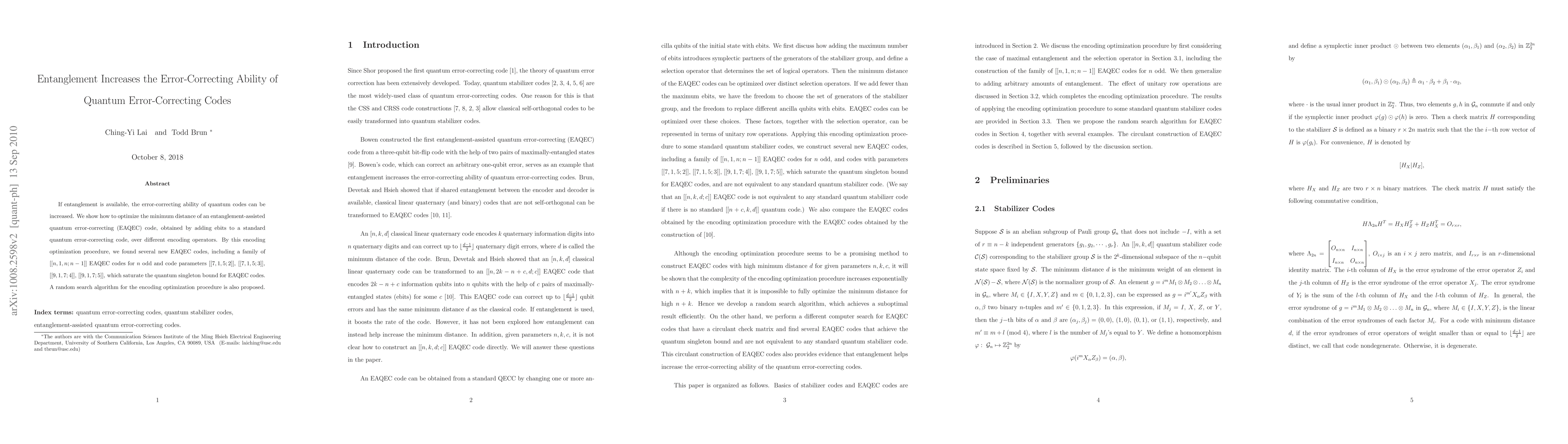 This paper demonstrates that entanglement enhances the error-correcting capability of quantum error-correcting codes (EAQEC). The authors optimize the minimum distance of EAQEC codes by incorporating entanglement, discovering new codes that saturate the quantum singleton bound, including a family of [[n, 1, n; n-1]] codes for odd n.