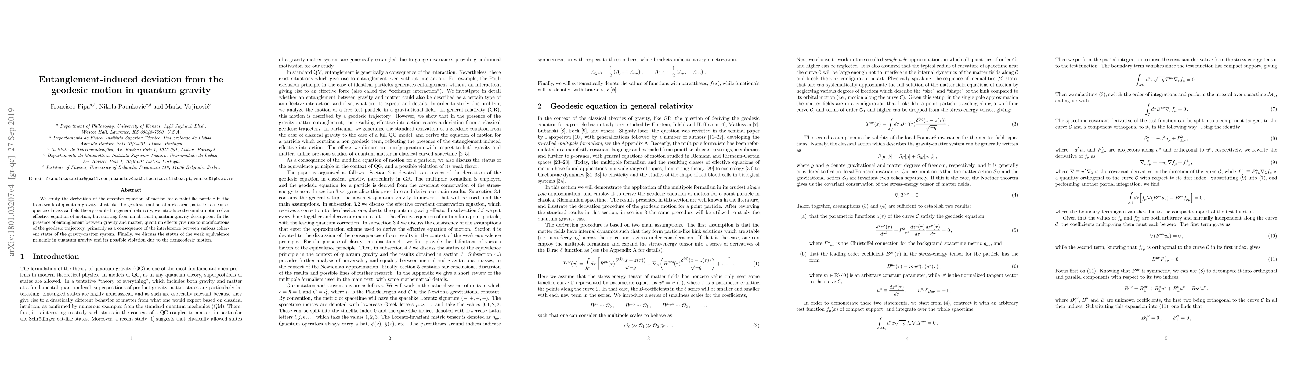 This paper investigates the effective equation of motion for a particle in quantum gravity, revealing that entanglement between gravity and matter can lead to deviations from geodesic motion. The study also explores the implications for the weak equivalence principle in quantum gravity.