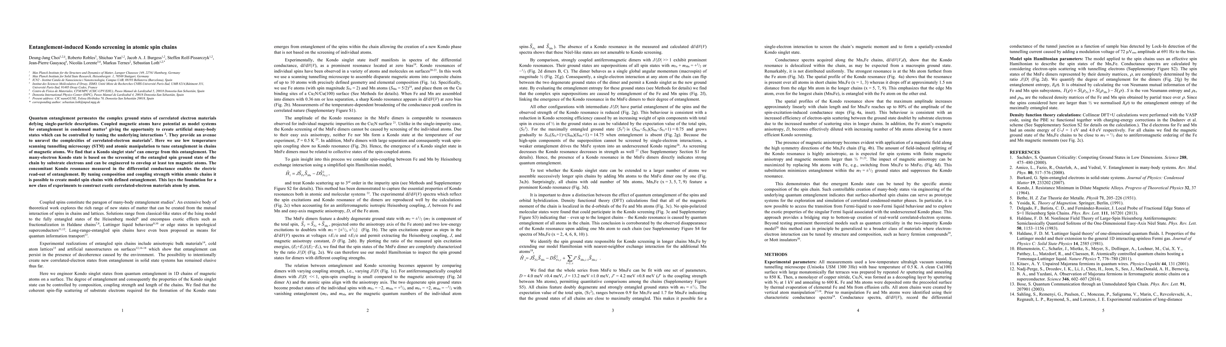 This research demonstrates that quantum entanglement in chains of magnetic atoms can induce a Kondo singlet state, revealing how entangled spin ground states can be screened by substrate electrons. The study uses STM to manipulate entanglement and shows that this screening can be engineered to affect multiple atoms, providing a new method for constructing correlated-electron materials atom by atom.