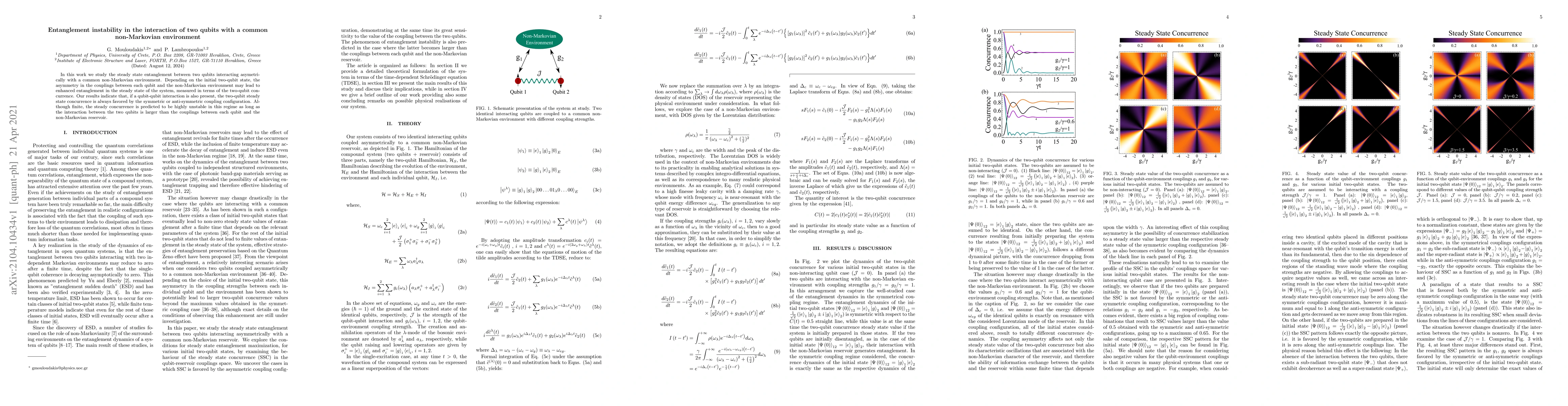 In this work we study the steady state entanglement between two qubits interacting asymetrically with a common non-Markovian environment. Depending on the initial two-qubit state, the asymmetry in the couplings between each qubit and the non-Markovian environment may lead to enhanced entanglement in the steady state of the system, measured in terms of the two-qubit concurrence. Our results indicate that, if a qubit-qubit interaction is also present, the two-qubit steady state concurrence is always favored by the symmetric or anti-symmetric coupling configuration. Although finite, the steady concurrence is predicted to be highly unstable in this regime as long as the interaction between the two qubits is larger than the couplings between each qubit and the non-Markovian reservoir.