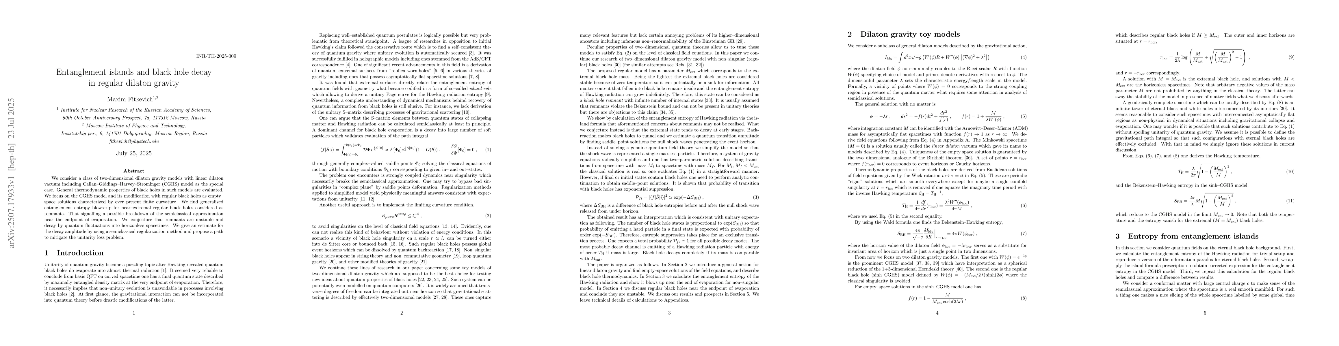 We consider a class of two-dimensional dilaton gravity models with linear dilaton vacuum including Callan-Giddings-Harvey-Strominger (CGHS) model as the special case. General thermodynamic properties of black holes in such models are evaluated. We focus on the CGHS model and its modification with regular black holes as empty-space solutions characterized by ever-present finite curvature. We find generalized entanglement entropy blows-up for near-extremal regular black holes considered as remnants. That signalling a possible breakdown of the semiclassical approximation near the endpoint of evaporation. We conjecture that remnants are unstable and decay by quantum fluctuations into horizonless spacetimes. We give an estimate for the decay amplitude by using a semiclassical regularization method and propose a path to mitigate the unitarity loss problem.