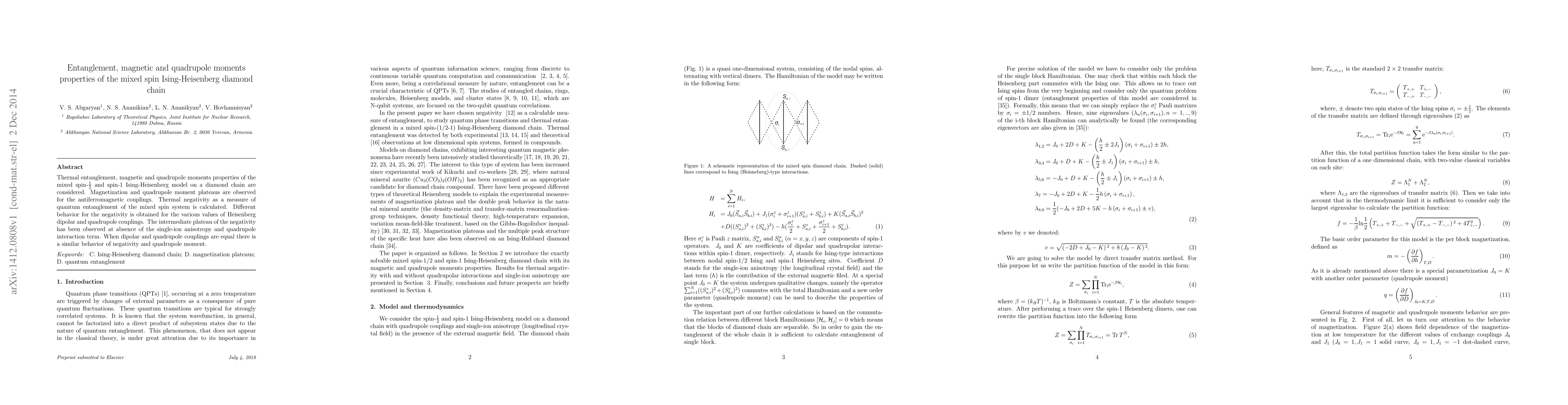 This paper investigates the thermal entanglement, magnetic, and quadrupole moments in a mixed spin-1/2 and spin-1 Ising-Heisenberg diamond chain. It finds magnetization and quadrupole moment plateaus under antiferromagnetic couplings, and observes distinct thermal negativity behaviors depending on the strength of dipolar and quadrupole interactions.