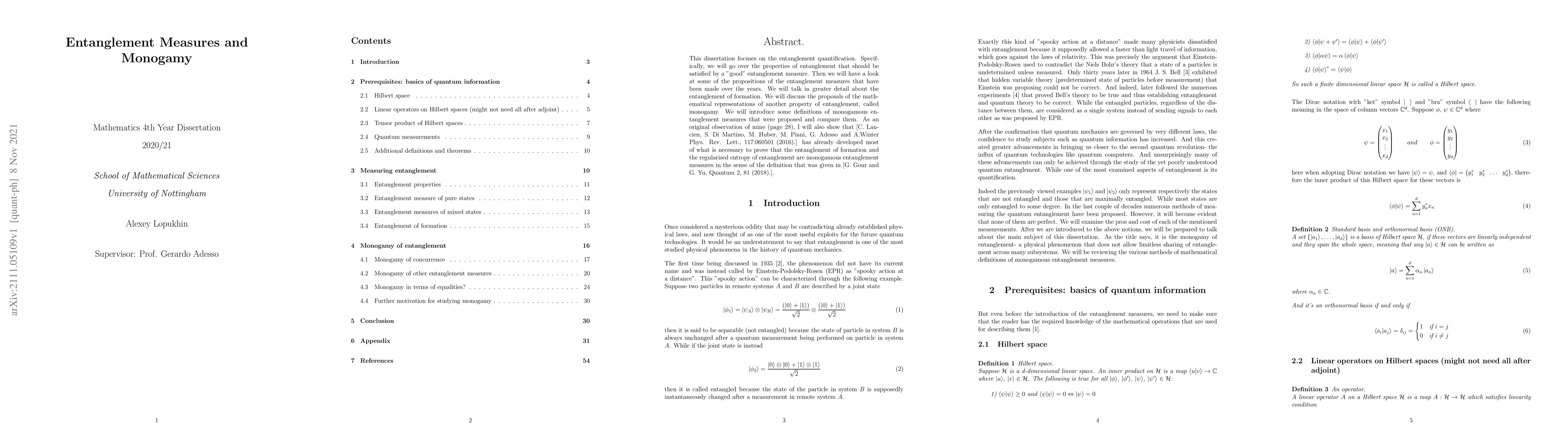 This dissertation will serve as an introduction to entanglement quantification, containing highly detailed proofs ensuring solid understanding of the subject. Specifically, we will review the properties of entanglement that should be satisfied by a "good" entanglement measure. Then we will have a look at some of the propositions of the entanglement measures that have been made over the years. We will review in greater detail the entanglement of formation. We will discuss the proposals of the mathematical representations of another property of entanglement, called monogamy. We will introduce some definitions of monogamous entanglement measures that were proposed and compare them. As an original observation of mine (page 28), I will also show that "Should Entanglement Measures be Monogamous or Faithful?" (arXiv:1604.02189) has already developed most of what is necessary to prove that the entanglement of formation and the regularised entropy of entanglement are monogamous entanglement measures in the sense of the definition that was given in "Monogamy of entanglement without inequalities" (arXiv:1710.03295).