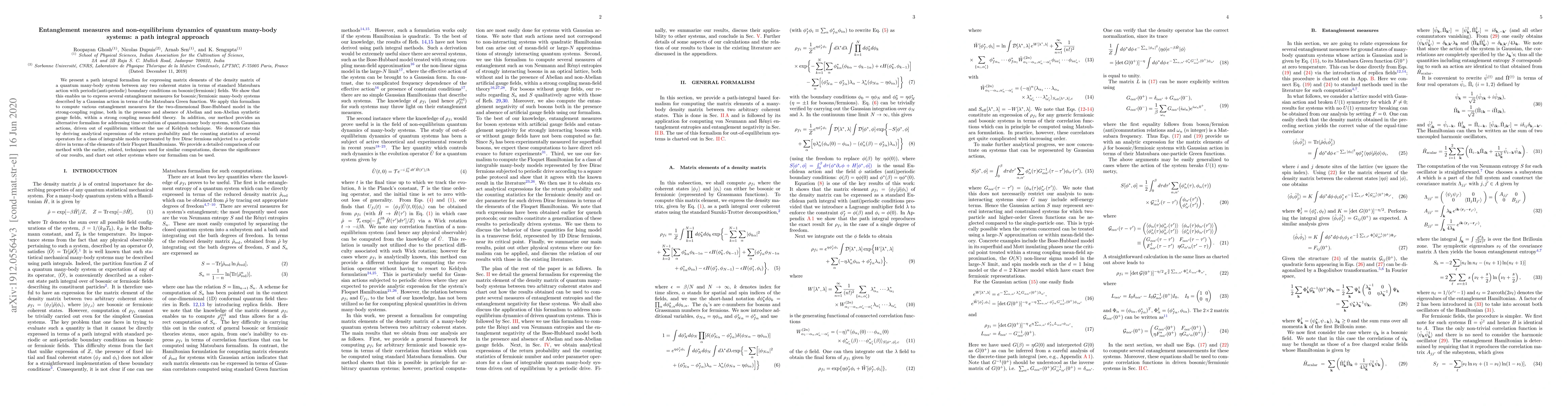 This research introduces a path integral formalism to express matrix elements of quantum many-body systems' density matrix between coherent states using Matsubara actions. It applies this to compute entanglement measures for Gaussian action systems, like the Bose-Hubbard model with gauge fields, within strong coupling mean-field theory. The method also offers an alternative for studying time evolution of driven, integrable models, presenting analytical expressions for return probability and counting statistics, without relying on the Keldysh technique.