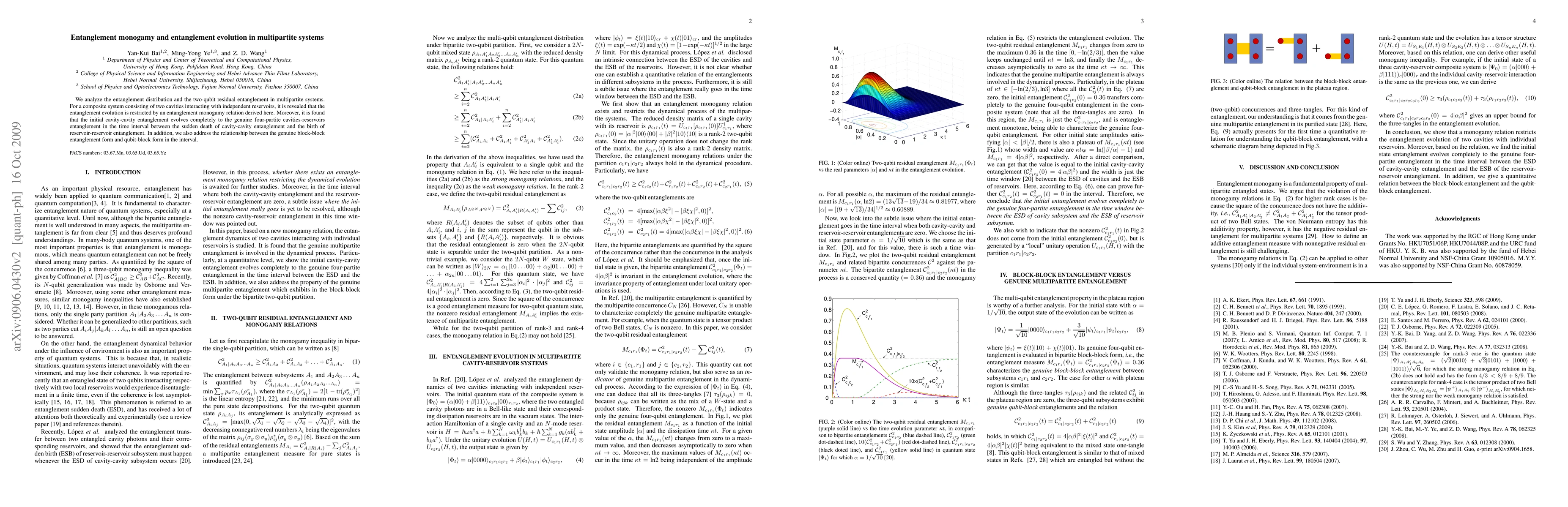 This paper investigates entanglement monogamy and its evolution in multipartite systems, revealing that initial cavity-cavity entanglement transforms into genuine four-partite cavities-reservoirs entanglement, governed by a newly derived entanglement monogamy relation. It also explores the relationship between different forms of entanglement during this transition.