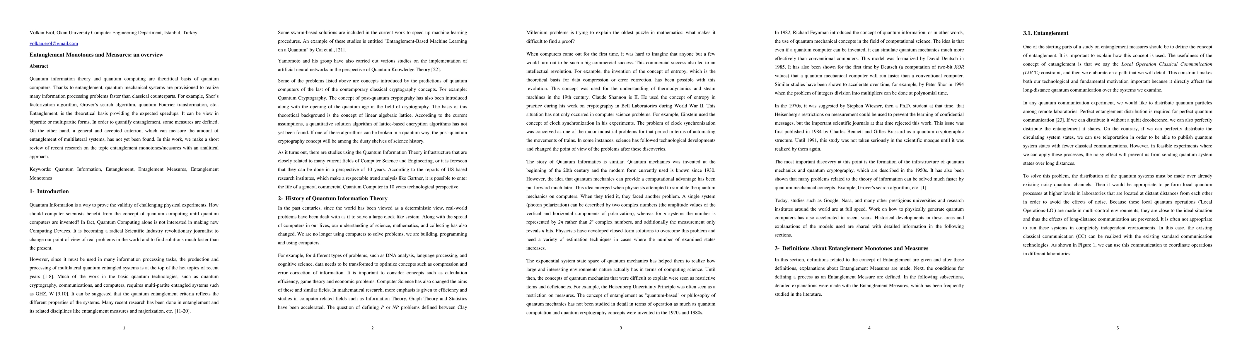 Quantum information theory and quantum computing are theoritical basis of quantum computers. Thanks to entanglement, quantum mechanical systems are provisioned to realize many information processing problems faster than classical counterparts. For example, Shor factorization algorithm, Grover search algorithm, quantum Fourrier transformation, etc. Entanglement, is the theoretical basis providing the expected speedups. It can be view in bipartite or multipartite forms. In order to quantify entanglement, some measures are defined. On the other hand, a general and accepted criterion, which can measure the amount of entanglement of multilateral systems, has not yet been found. In this work, we make a short review of recent research on the topic entanglement monotones and measures with an analitical approach.