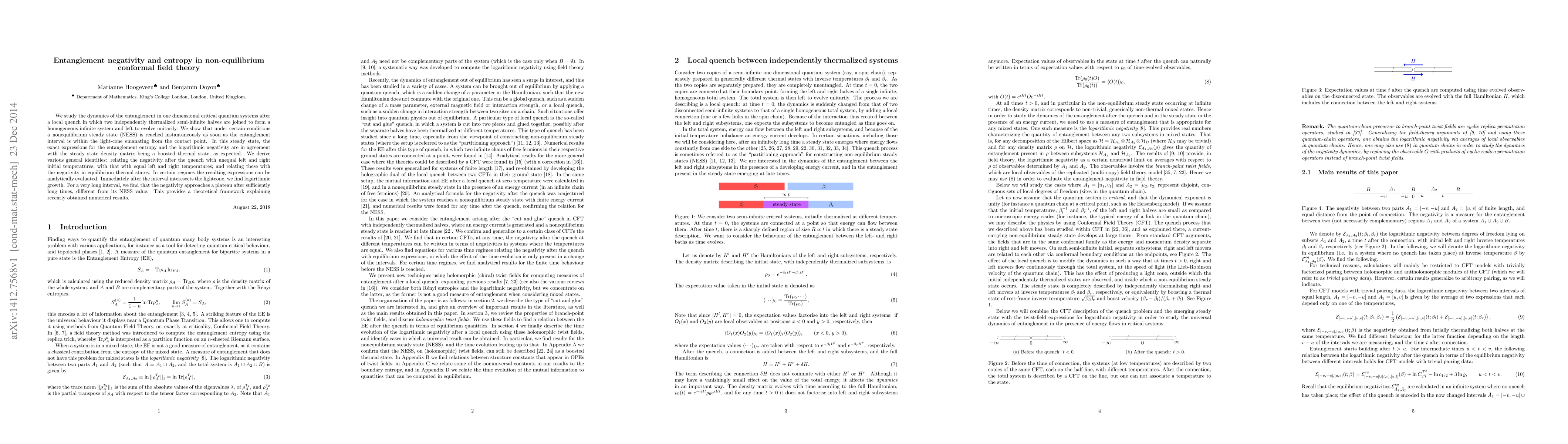 We study the dynamics of the entanglement in one dimensional critical quantum systems after a local quench in which two independently thermalized semi-infinite halves are joined to form a homogeneous infinite system and left to evolve unitarily. We show that under certain conditions a nonequilibrium steady state (NESS) is reached instantaneously as soon as the entanglement interval is within the light-cone emanating from the contact point. In this steady state, the exact expressions for the entanglement entropy and the logarithmic negativity are in agreement with the steady state density matrix being a boosted thermal state, as expected. We derive various general identities: relating the negativity after the quench with unequal left and right initial temperatures, with that with equal left and right temperatures; and relating these with the negativity in equilibrium thermal states. In certain regimes the resulting expressions can be analytically evaluated. Immediately after the interval interesects the lightcone, we find logarithmic growth. For a very long interval, we find that the negativity approaches a plateau after sufficiently long times, different from its NESS value. This provides a theoretical framework explaining recently obtained numerical results.