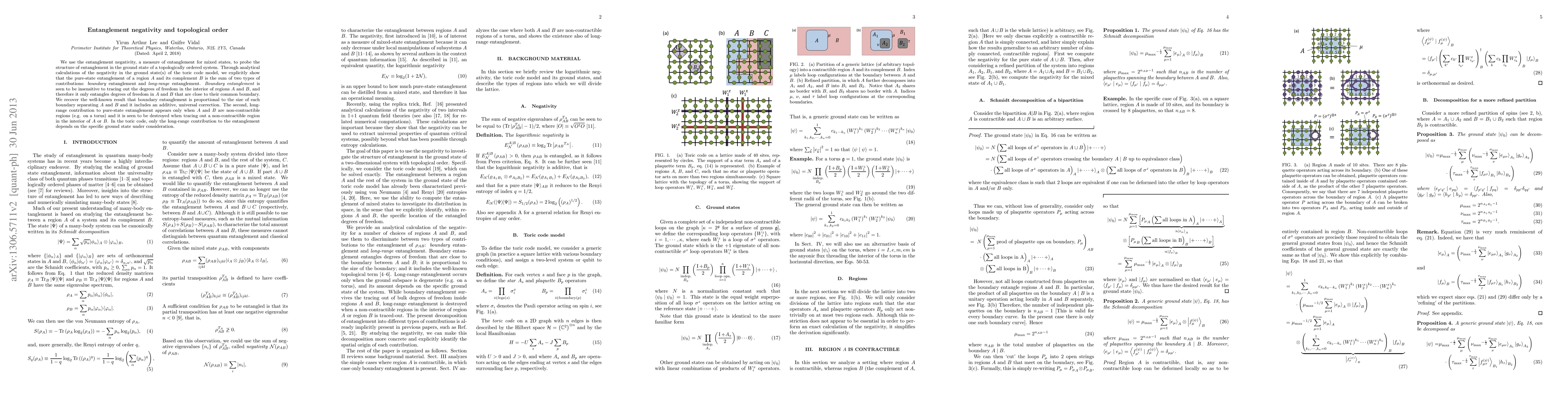 We use the entanglement negativity, a measure of entanglement for mixed states, to probe the structure of entanglement in the ground state of a topologically ordered system. Through analytical calculations of the negativity in the ground state(s) of the toric code model, we explicitly show that the entanglement of a region $A$ and its complement $B$ is the sum of two types of contributions. The first type of contributions consists of \textit{boundary entanglement}, which we see to be insensitive to tracing out the interior of $A$ and $B$. It therefore entangles only degrees of freedom in $A$ and $B$ that are close to their common boundary. As it is well-known, each boundary contribution is proportional to the size of the relevant boundary separating $A$ and $B$ and it includes an additive, universal correction. The second contribution appears only when $A$ and $B$ are non-contractible regions (e.g. on a torus) and it consists of long-range entanglement, which we see to be destroyed when tracing out a non-contractible region in the interior of $A$ or $B$. Only the long-range contribution to the entanglement may depend on the specific ground state under consideration.