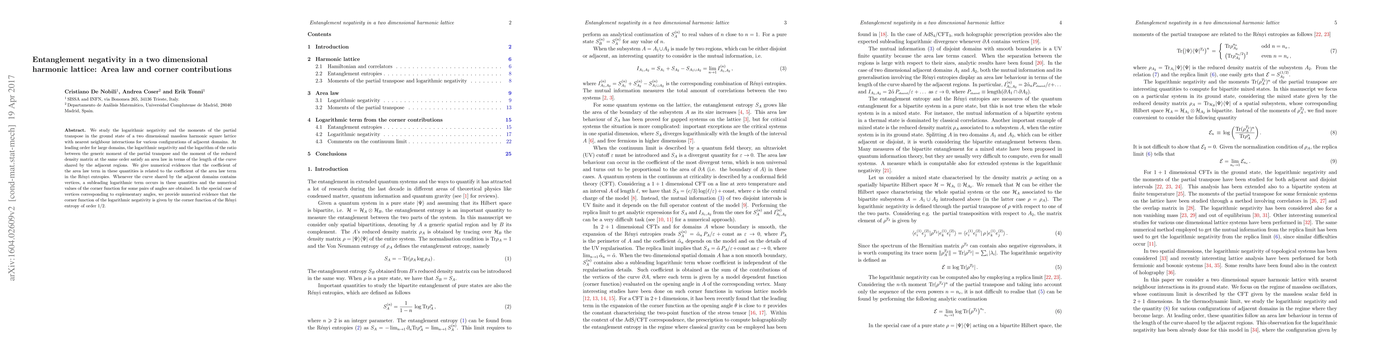 We study the logarithmic negativity and the moments of the partial transpose in the ground state of a two dimensional massless harmonic square lattice with nearest neighbour interactions for various configurations of adjacent domains. At leading order for large domains, the logarithmic negativity and the logarithm of the ratio between the generic moment of the partial transpose and the moment of the reduced density matrix at the same order satisfy an area law in terms of the length of the curve shared by the adjacent regions. We give numerical evidences that the coefficient of the area law term in these quantities is related to the coefficient of the area law term in the R\'enyi entropies. Whenever the curve shared by the adjacent domains contains vertices, a subleading logarithmic term occurs in these quantities and the numerical values of the corner function for some pairs of angles are obtained. In the special case of vertices corresponding to explementary angles, we provide numerical evidence that the corner function of the logarithmic negativity is given by the corner function of the R\'enyi entropy of order 1/2.