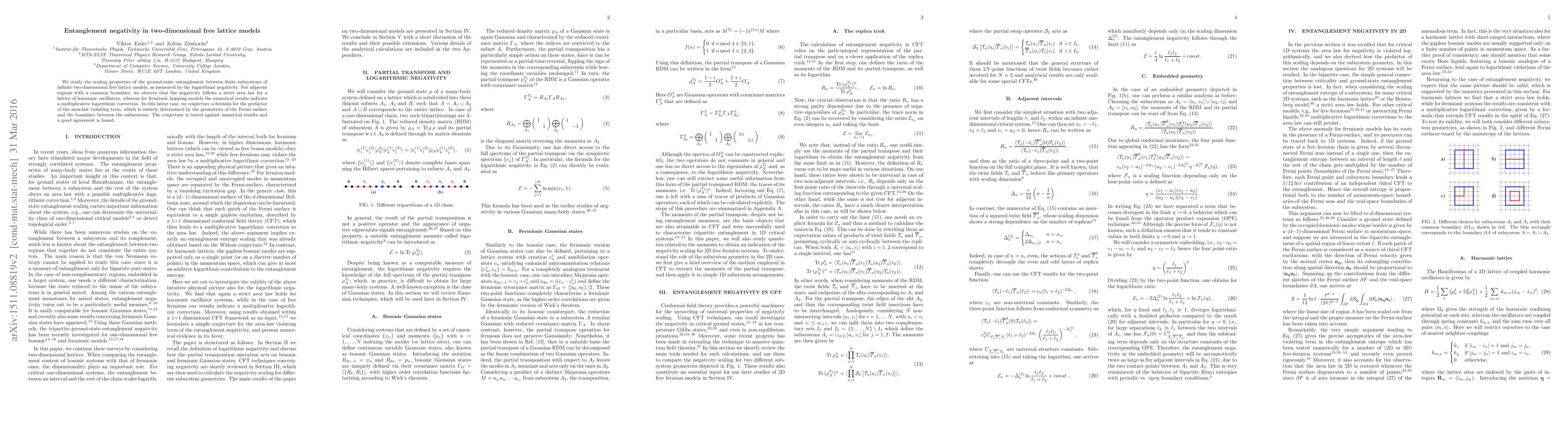 This paper investigates the scaling of entanglement negativity in two-dimensional free lattice models, finding an area law for harmonic oscillators but a logarithmic correction for fermionic models. A conjecture for the prefactor of the correction term is proposed and validated through numerical results.