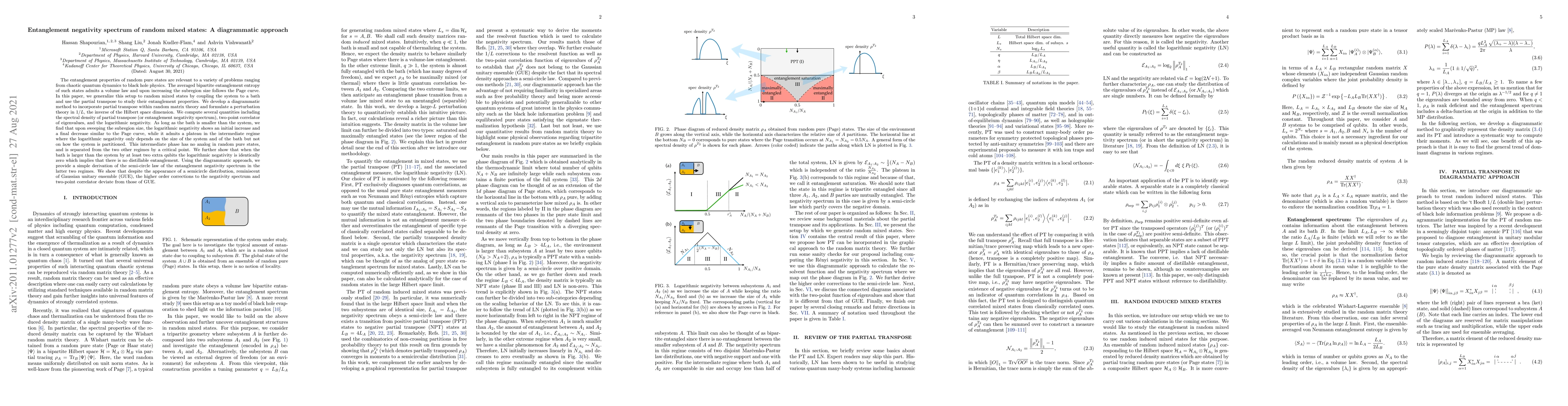 This paper develops a diagrammatic method to study the entanglement properties of random mixed quantum states by coupling the system to a bath and using the partial transpose. It finds an intermediate phase in the entanglement negativity spectrum, not present in pure states, and shows that when the bath is larger than the system, there is no distillable entanglement.