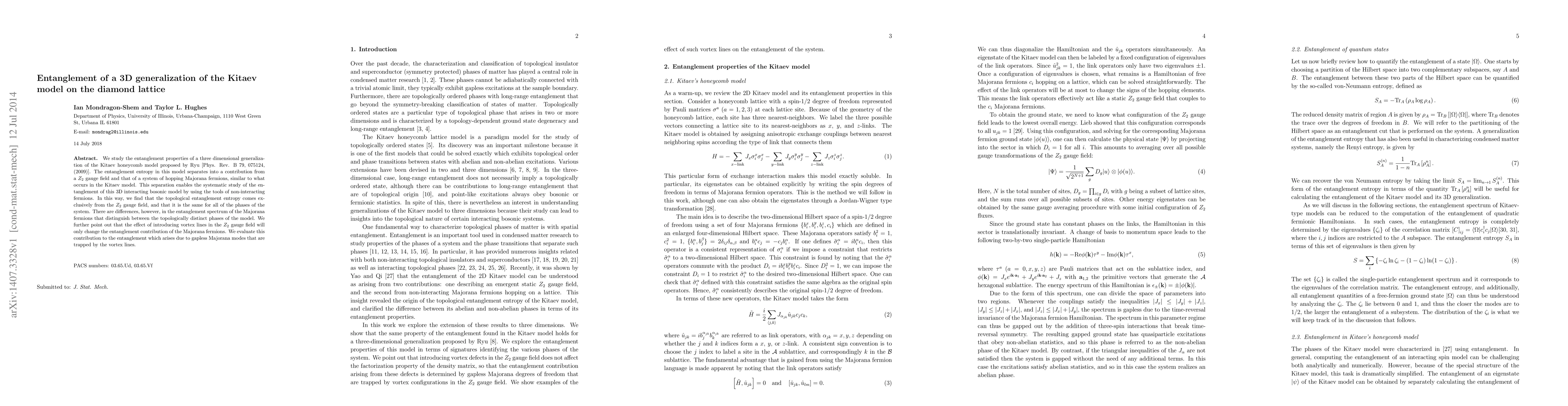 This paper investigates the entanglement properties of a 3D Kitaev model on the diamond lattice, revealing that the entanglement entropy separates into contributions from a $Z_2$ gauge field and Majorana fermions. The topological entanglement entropy is found to be exclusively from the $Z_2$ gauge field, remaining constant across phases, while the entanglement spectrum of Majorana fermions varies with topological phase distinctions.