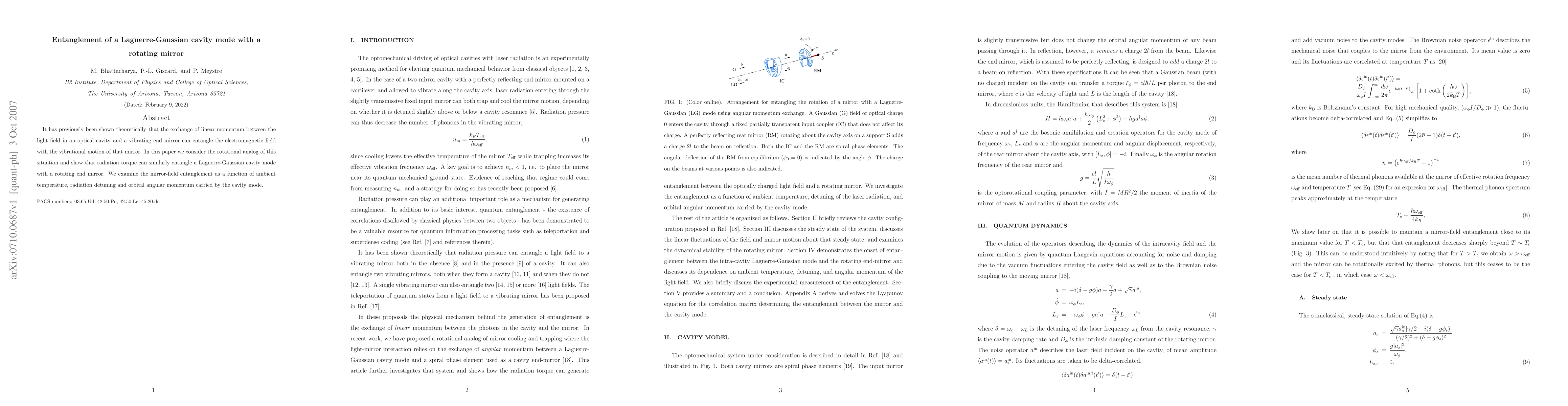 This paper demonstrates the entanglement between a Laguerre-Gaussian cavity mode and a rotating end mirror through radiation torque, exploring the effects of temperature, detuning, and the cavity mode's orbital angular momentum on the mirror-field entanglement.