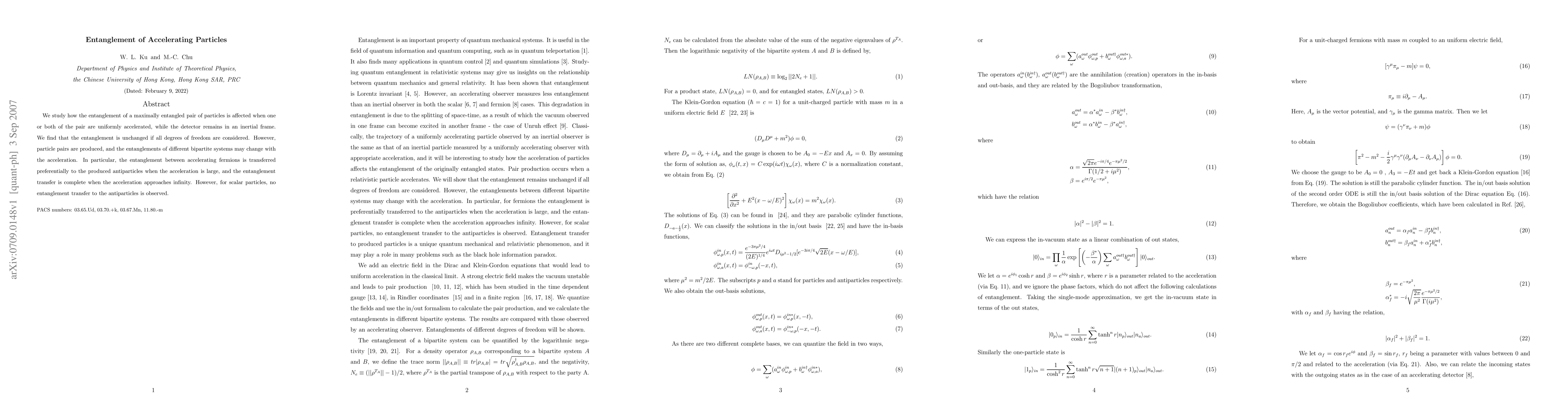 Accelerating particles show no change in entanglement when considering all degrees of freedom, but entanglement transfer occurs to antiparticles with large acceleration for fermions.