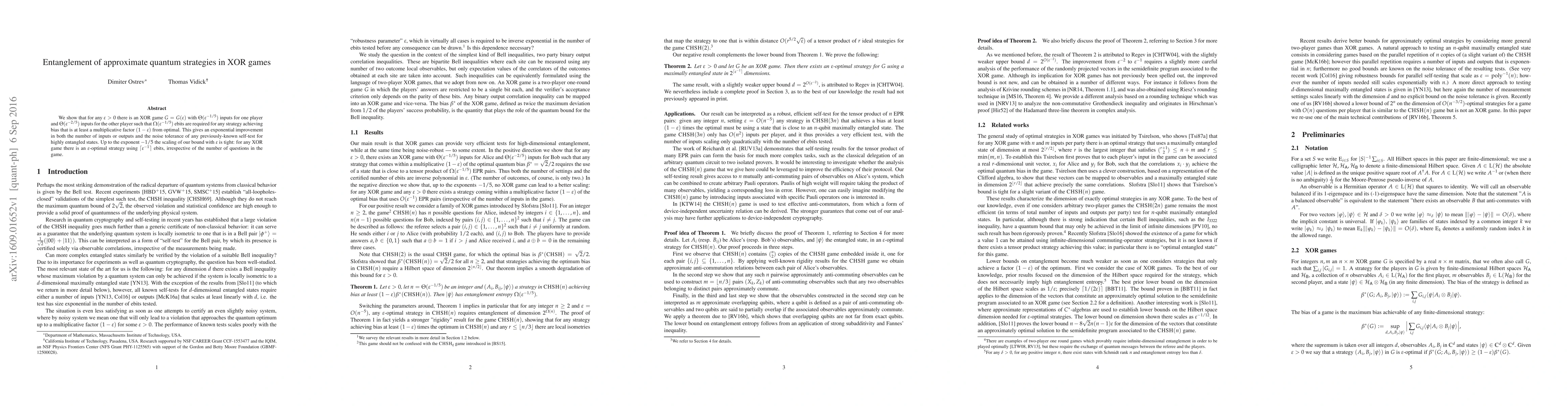 Researchers demonstrate that highly entangled states can detect approximate quantum strategies with exponential improvement in inputs or outputs and noise tolerance compared to existing methods. They also show that for any XOR game, an optimal strategy using a specific number of ebits is achievable regardless of the number of questions.