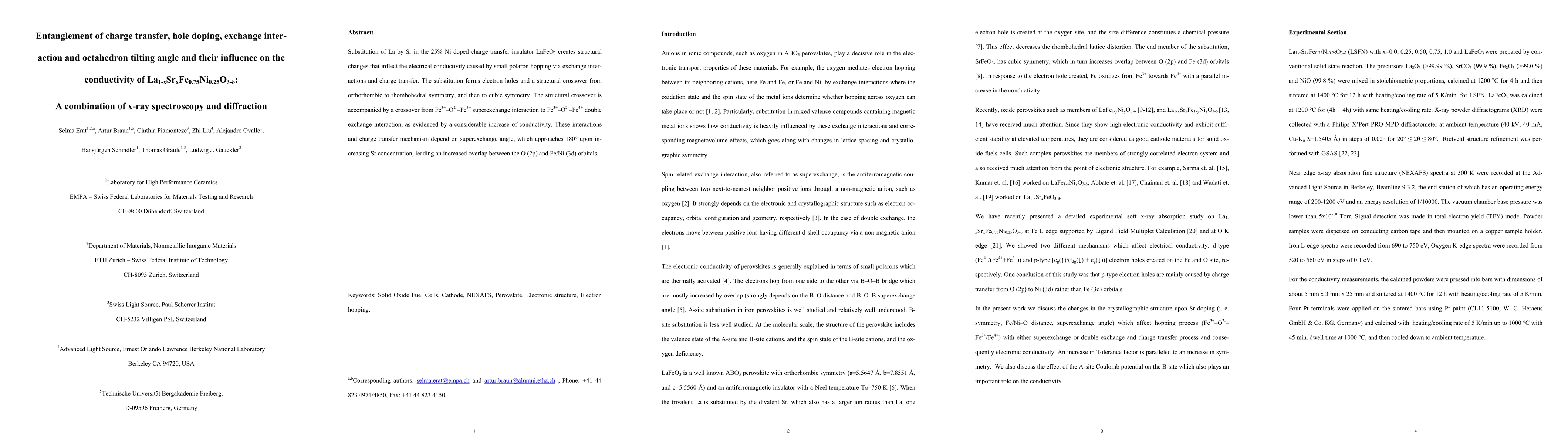 Substitution of La by Sr in the 25% Ni doped charge transfer insulator LaFeO3 creates structural changes that inflect the electrical conductivity caused by small polaron hopping via exchange interactions and charge transfer. The substitution forms electron holes and a structural crossover from orthorhombic to rhombohedral symmetry, and then to cubic symmetry. The structural crossover is accompanied by a crossover from Fe3+-O2--Fe3+ superexchange interaction to Fe3+-O2--Fe4+ double exchange interaction, as evidenced by a considerable increase of conductivity. These interactions and charge transfer mechanism depend on superexchange angle, which approaches 180{\deg} upon increasing Sr concentration, leading an increased overlap between the O (2p) and Fe/Ni (3d) orbitals.