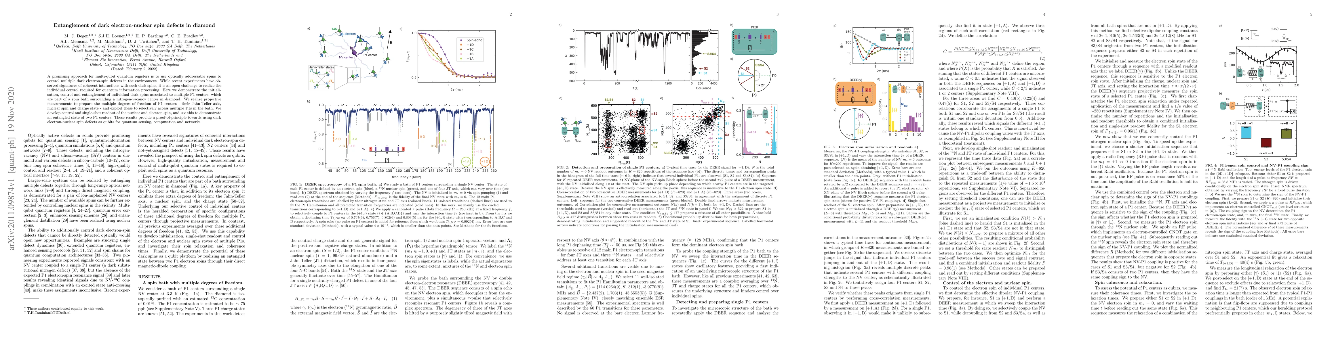 This paper demonstrates the initialization, control, and entanglement of dark electron-nuclear spin defects in diamond, specifically P1 centers, using optically addressable spins. The study provides a proof-of-principle for utilizing these defects as qubits for quantum information processing.