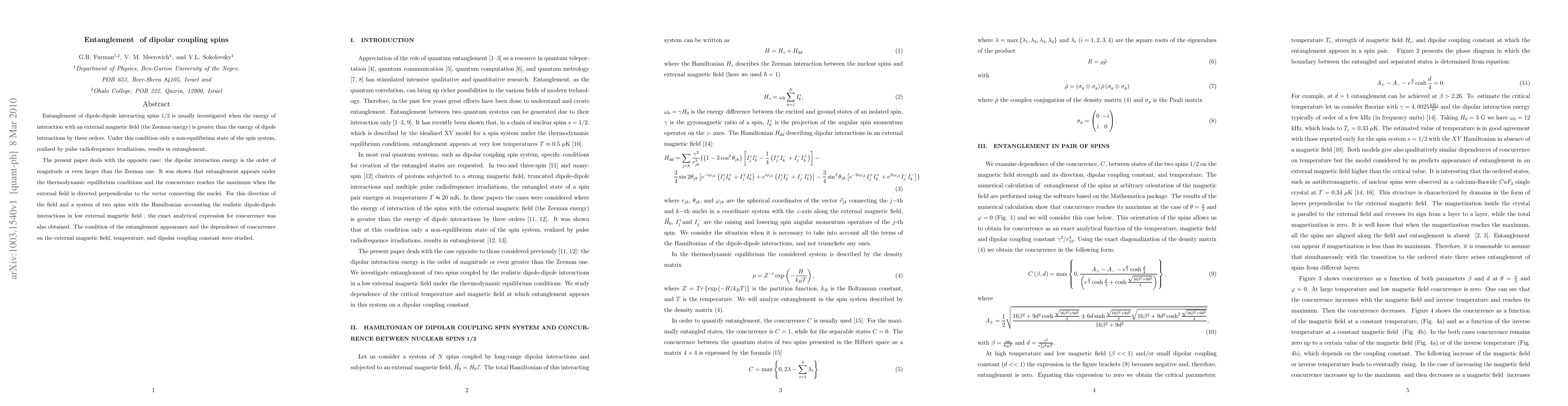 This paper explores entanglement in dipole-dipole interacting spins 1/2 under conditions where the dipole interaction energy exceeds the Zeeman energy by several orders. It demonstrates that entanglement can occur under thermodynamic equilibrium, with maximum concurrence when the external magnetic field is perpendicular to the nuclei vector, and provides an exact analytical expression for concurrence under these conditions.