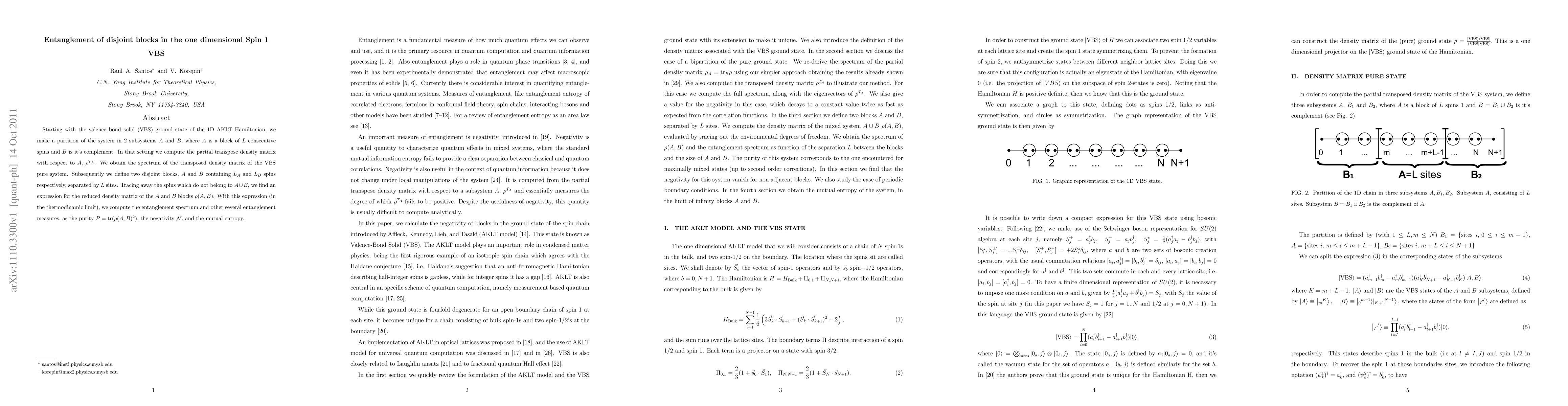 This paper investigates the entanglement properties of disjoint blocks in the 1D Spin 1 valence bond solid (VBS) ground state, specifically the AKLT model. It computes the entanglement spectrum and various entanglement measures for the reduced density matrix of two separated blocks, revealing insights into their entanglement characteristics.