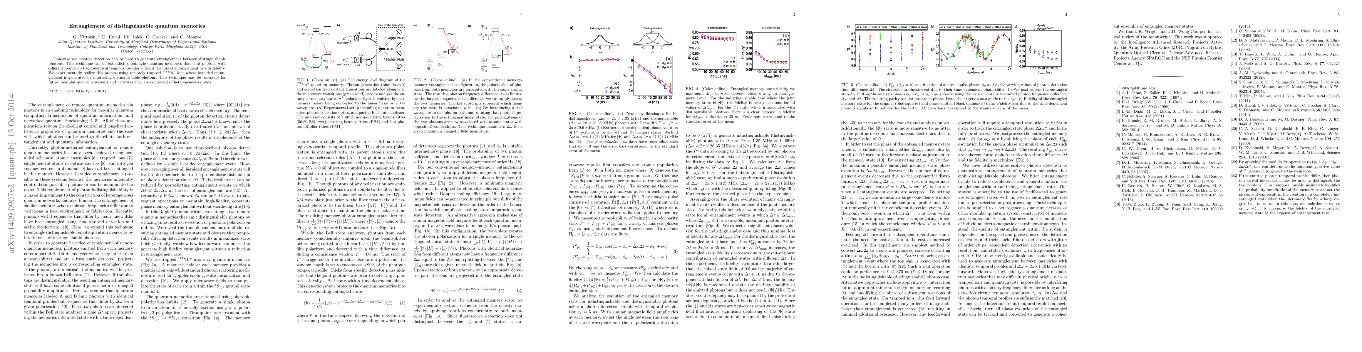 This paper demonstrates the generation of entanglement between distinguishable quantum memories using time-resolved photon detection and interference, realized experimentally with remotely trapped $^{171}$Yb$^+$ ions. This technique maintains entanglement rate and fidelity, potentially aiding future modular quantum systems.