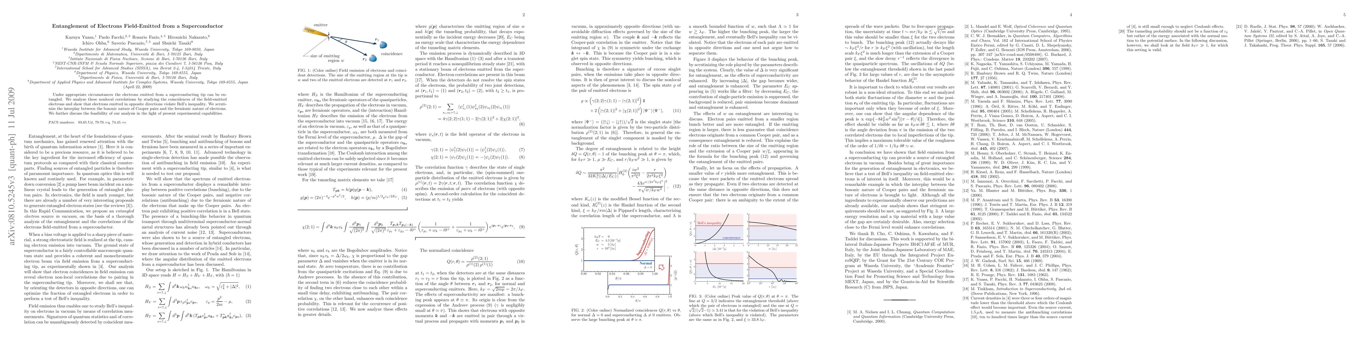 This paper investigates the entanglement of electrons emitted from a superconducting tip, demonstrating nonlocal correlations through field-emission coincidences that violate Bell's inequality. It explores the relationship between the bosonic Cooper pairs and the fermionic nature of emitted electrons, and assesses the practicality of this analysis given current experimental technology.