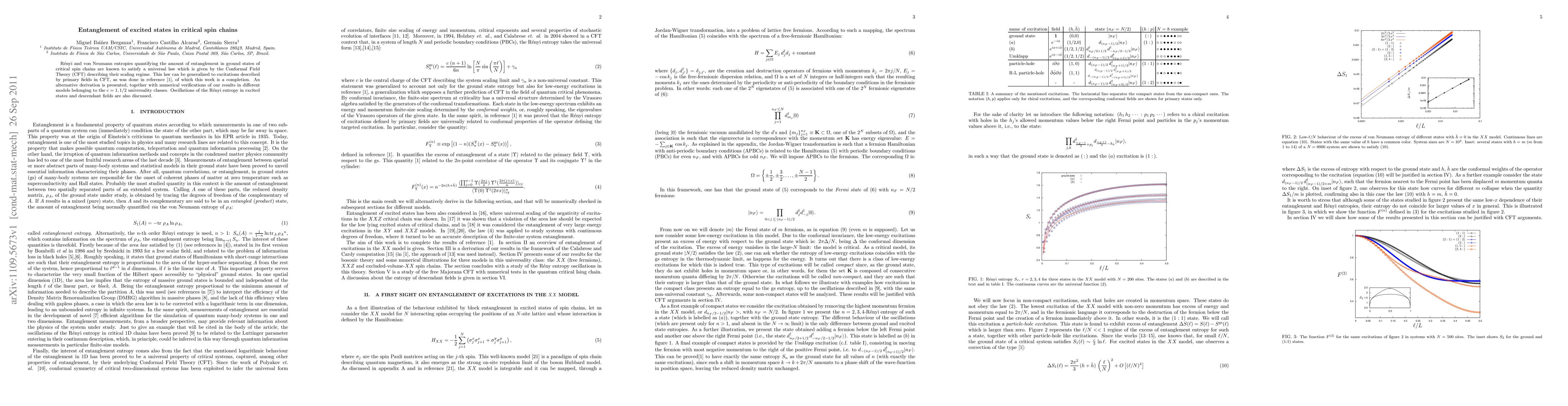 Renyi and von Neumann entropies quantifying the amount of entanglement in ground states of critical spin chains are known to satisfy a universal law which is given by the Conformal Field Theory (CFT) describing their scaling regime. This law can be generalized to excitations described by primary fields in CFT, as was done in reference (Alcaraz et. al., Phys. Rev. Lett. 106, 201601 (2011)), of which this work is a completion. An alternative derivation is presented, together with numerical verifications of our results in different models belonging to the c=1,1/2 universality classes. Oscillations of the Renyi entropy in excited states and descendant fields are also discussed.