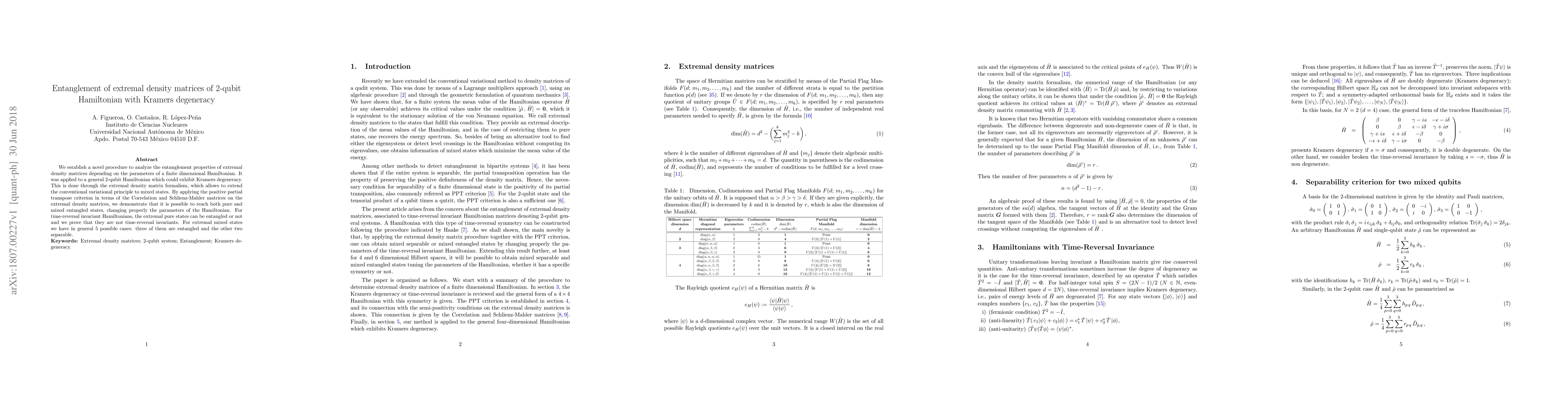 We establish a novel procedure to analyze the entanglement properties of extremal density matrices depending on the parameters of a finite dimensional Hamiltonian. It was applied to a general 2-qubit Hamiltonian which could exhibit Kramers degeneracy. This is done through the extremal density matrix formalism, which allows to extend the conventional variational principle to mixed states. By applying the positive partial transpose criterion in terms of the Correlation and Schlienz-Mahler matrices on the extremal density matrices, we demonstrate that it is possible to reach both pure and mixed entangled states, changing properly the parameters of the Hamiltonian. For time-reversal invariant Hamiltonians, the extremal pure states can be entangled or not and we prove that they are not time-reversal invariants. For extremal mixed states we have in general 5 possible cases: three of them are entangled and the other two separable.