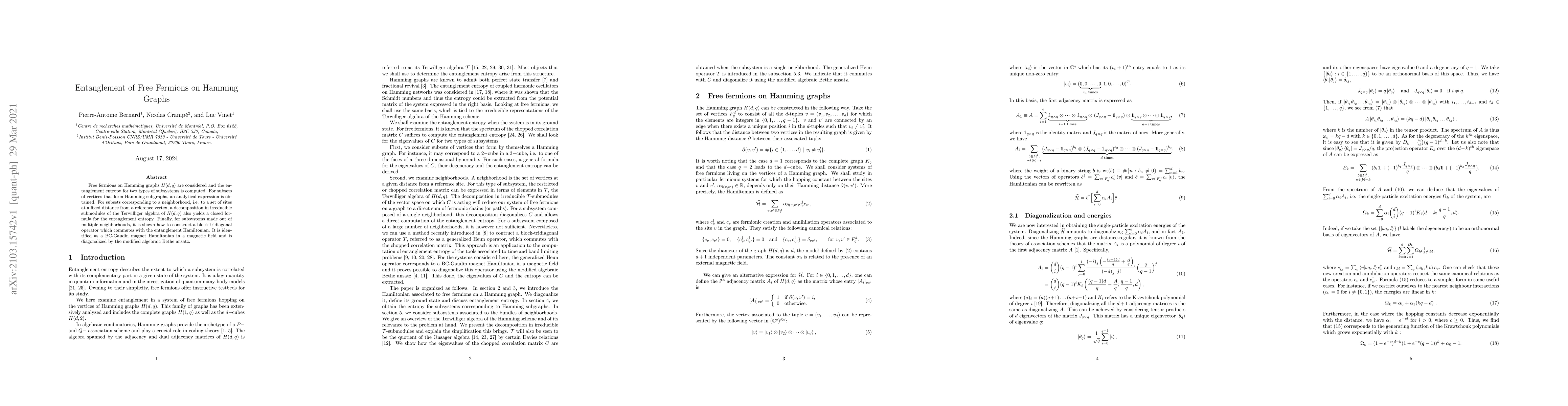 This paper computes entanglement entropy for free fermions on Hamming graphs, deriving analytical expressions for subsets forming Hamming subgraphs and neighborhoods. It also constructs a block-tridiagonal operator for multiple neighborhoods, identifying it as a BC-Gaudin magnet Hamiltonian, and diagonalizes it using the modified algebraic Bethe ansatz.