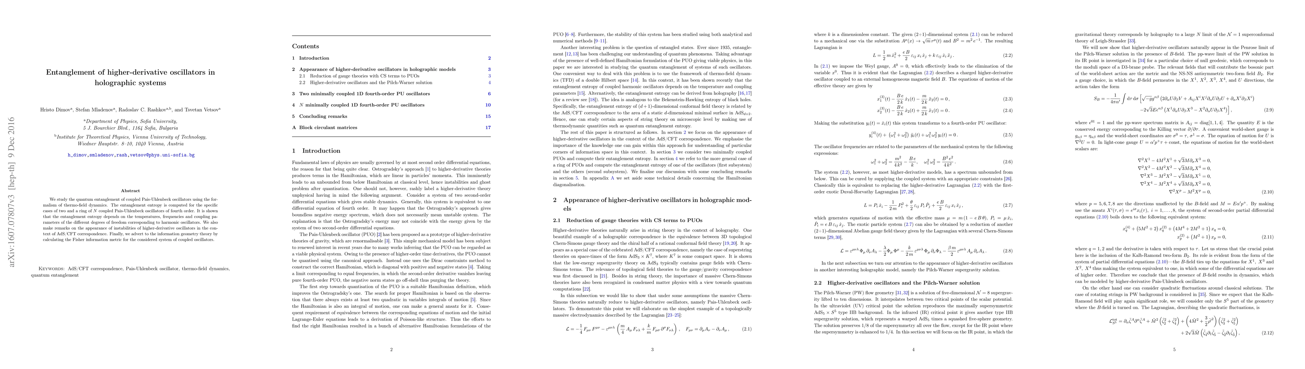 This paper investigates the quantum entanglement in coupled Pais-Uhlenbeck oscillators using thermo-field dynamics, finding that entanglement entropy varies with temperature, frequency, and coupling parameters. It also discusses instabilities in higher-derivative oscillators within the AdS/CFT framework and computes the Fisher information metric for information geometry.