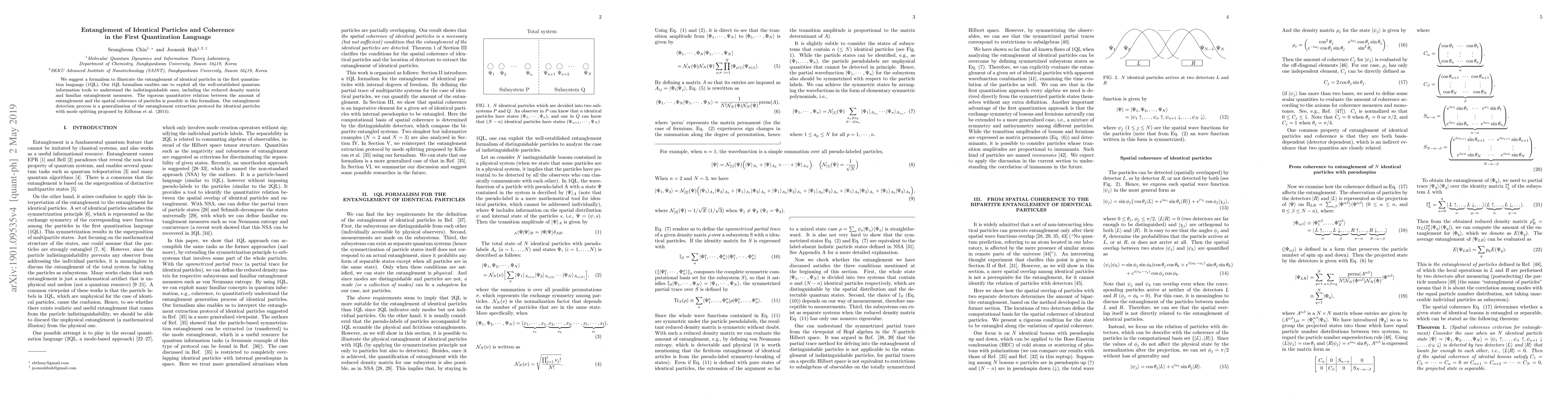 We suggest a formalism to illustrate the entanglement of identical particles in the first quantization language (1QL). Our 1QL formalism enables one to exploit all the well-established quantum information tools to understand the indistinguishable ones, including the reduced density matrix and familiar entanglement measures. The rigorous quantitative relation between the amount of entanglement and the spatial coherence of particles is possible in this formalism. Our entanglement detection process is a generalization of the entanglement extraction protocol for identical particles with mode splitting proposed by Killoran et al. (2014).