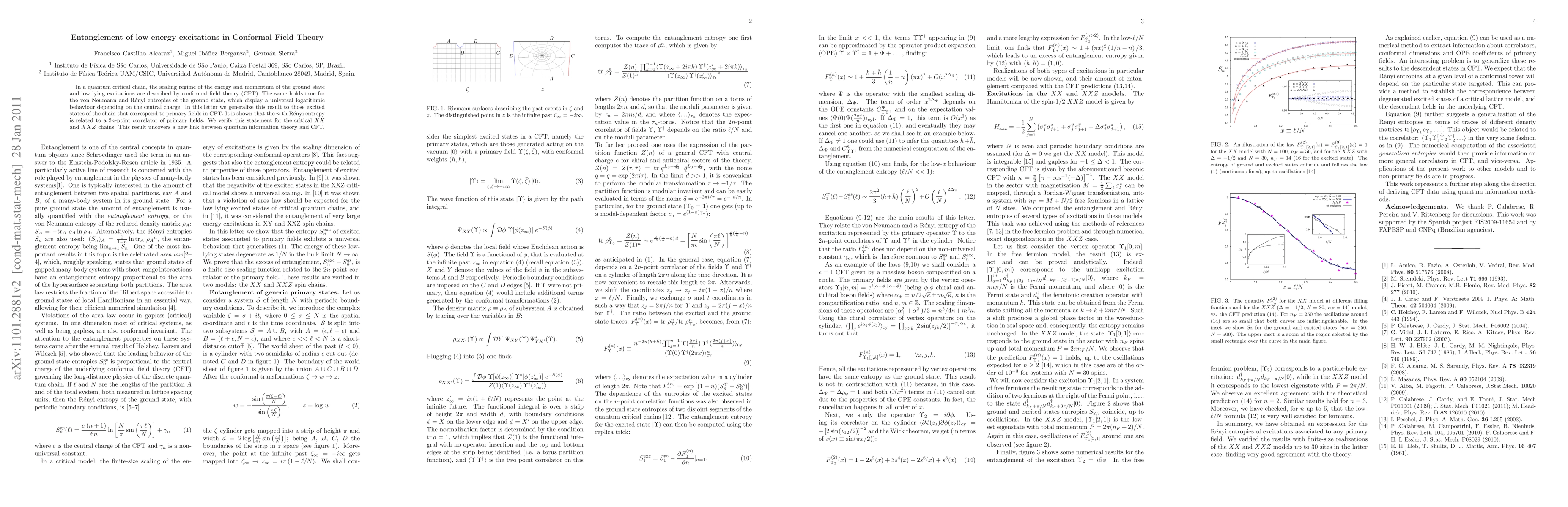 In a quantum critical chain, the scaling regime of the energy and momentum of the ground state and low lying excitations are described by conformal field theory (CFT). The same holds true for the von Neumann and Renyi entropies of the ground state, which display a universal logarithmic behaviour depending on the central charge. In this letter we generalize this result to those excited states of the chain that correspond to primary fields in CFT. It is shown that the n-th Renyi entropy is related to a 2n-point correlator of primary fields. We verify this statement for the critical XX and XXZ chains. This result uncovers a new link between quantum information theory and CFT.