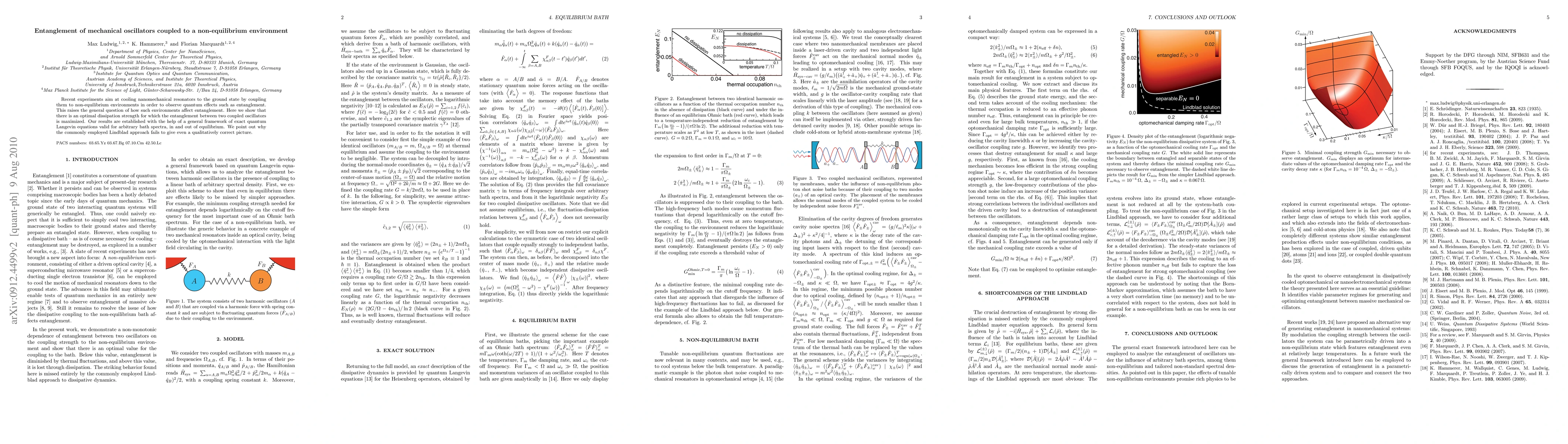 The research utilizes a general framework of exact quantum Langevin equations valid for arbitrary bath spectra, in and out of equilibrium, to analyze the entanglement of mechanical oscillators coupled to non-equilibrium environments.