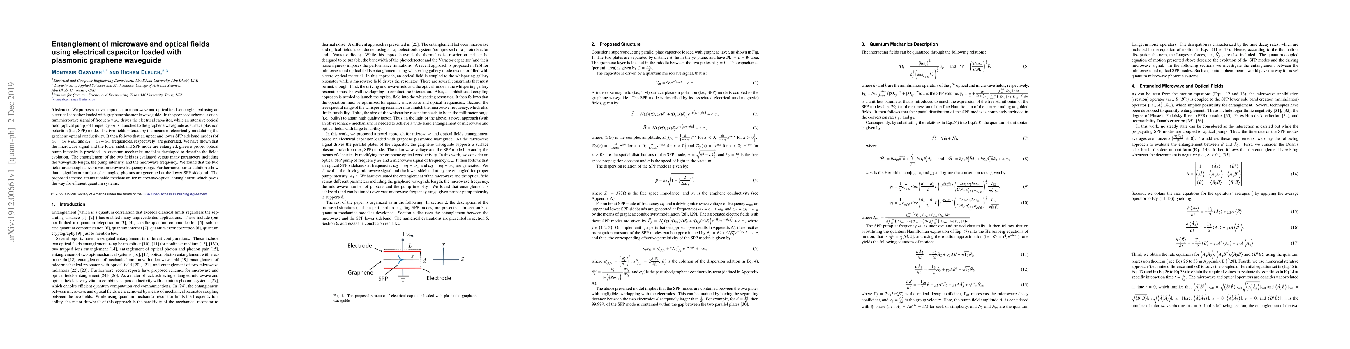 This research proposes a novel method to entangle microwave and optical fields using a graphene plasmonic waveguide loaded with an electrical capacitor. The entanglement occurs via modulation of graphene's optical conductivity, generating SPP sidebands, and is demonstrated over a wide microwave frequency range with high efficiency.