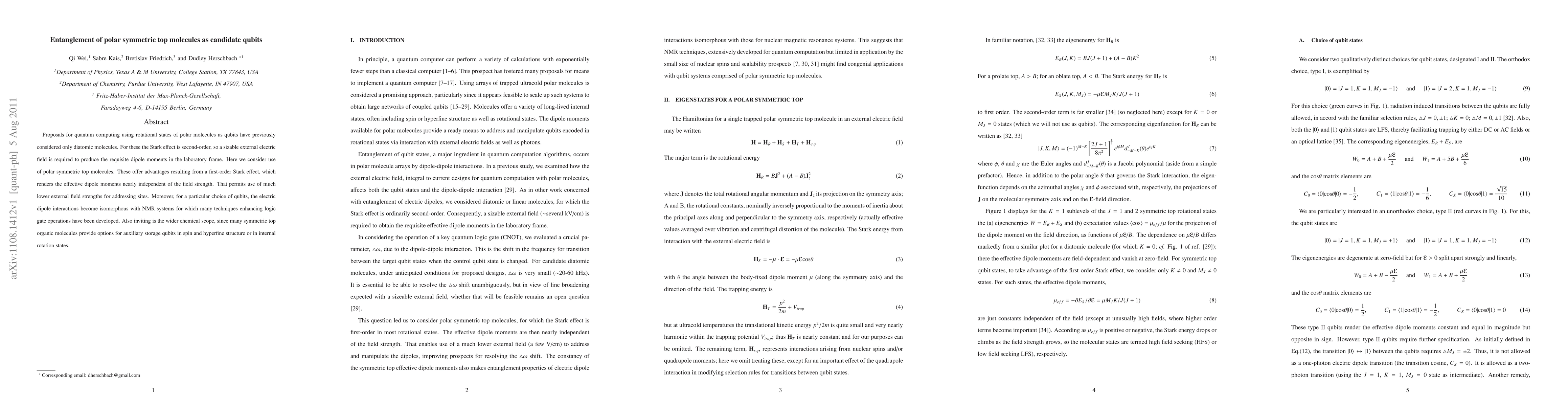 This paper proposes the use of polar symmetric top molecules for quantum computing qubits, leveraging a first-order Stark effect that allows for lower external field strengths compared to diatomic molecules. The study suggests that these molecules could offer advantages in electric dipole interactions and broader chemical options for additional storage qubits.