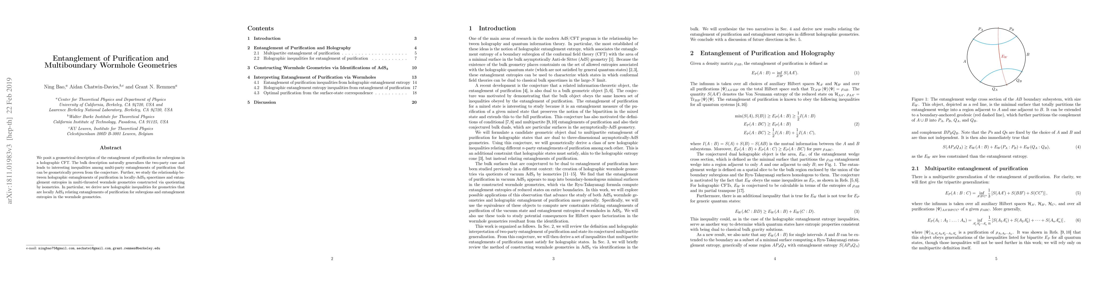 This paper explores the entanglement of purification in holographic conformal field theories (CFTs), extending the concept to multi-party systems and deriving new inequalities. It also investigates the connection between entanglements of purification in locally-AdS3 spacetimes and entanglement entropies in multiboundary wormhole geometries, establishing new holographic inequalities.