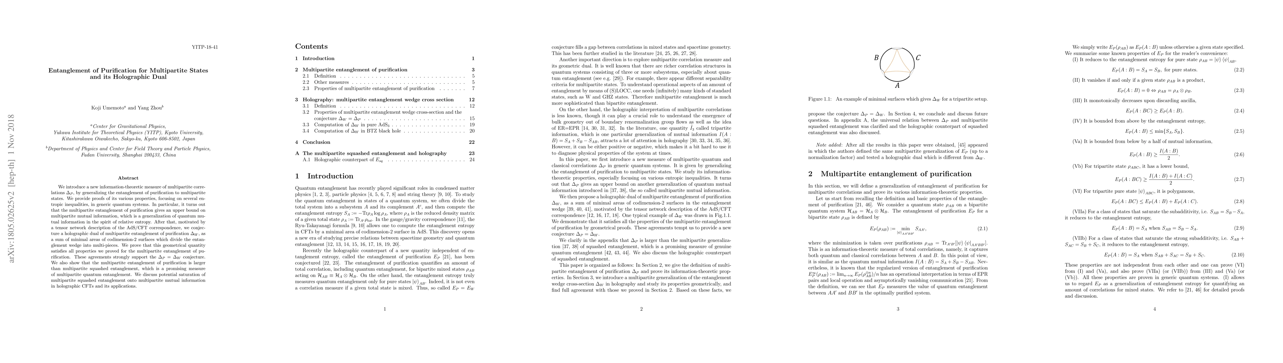 This paper introduces a new measure of multipartite quantum/classical correlations, $\Delta_P$, by generalizing entanglement of purification. It proves various properties, including entropic inequalities, and establishes $\Delta_P$ as an upper bound for multipartite mutual information and squashed entanglement. Additionally, it defines a holographic dual $\Delta_W$ and supports the $\Delta_{P}=\Delta_{W}$ conjecture through geometric properties.