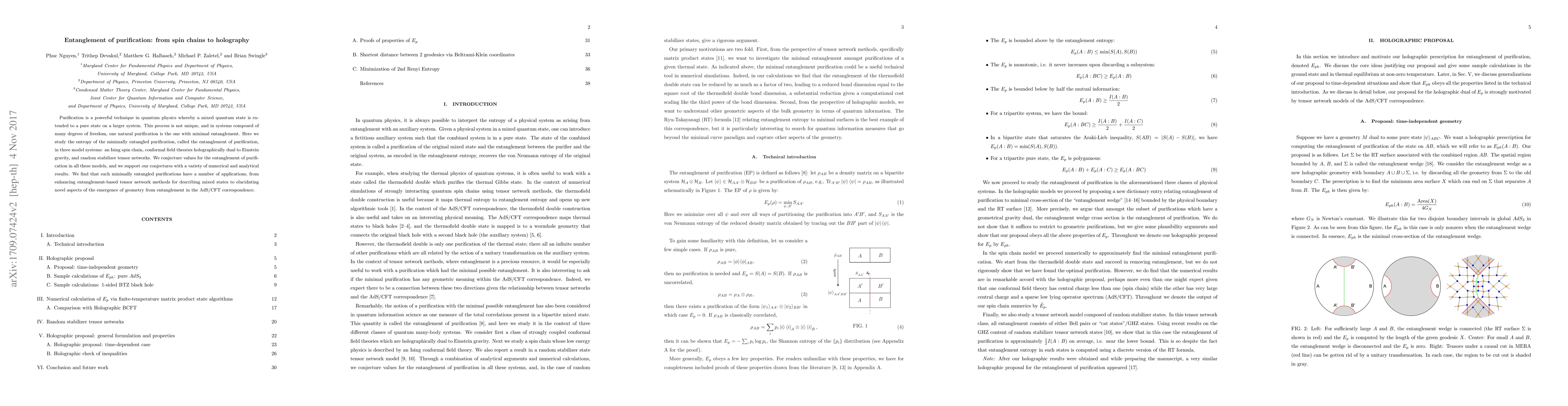 This paper investigates the entropy of the minimally entangled purification, termed the entanglement of purification, in three quantum systems: Ising spin chains, conformal field theories dual to Einstein gravity, and random stabilizer tensor networks. The authors propose values for this entropy and support their conjectures with numerical and analytical evidence, highlighting its applications in tensor network methods and the AdS/CFT correspondence.